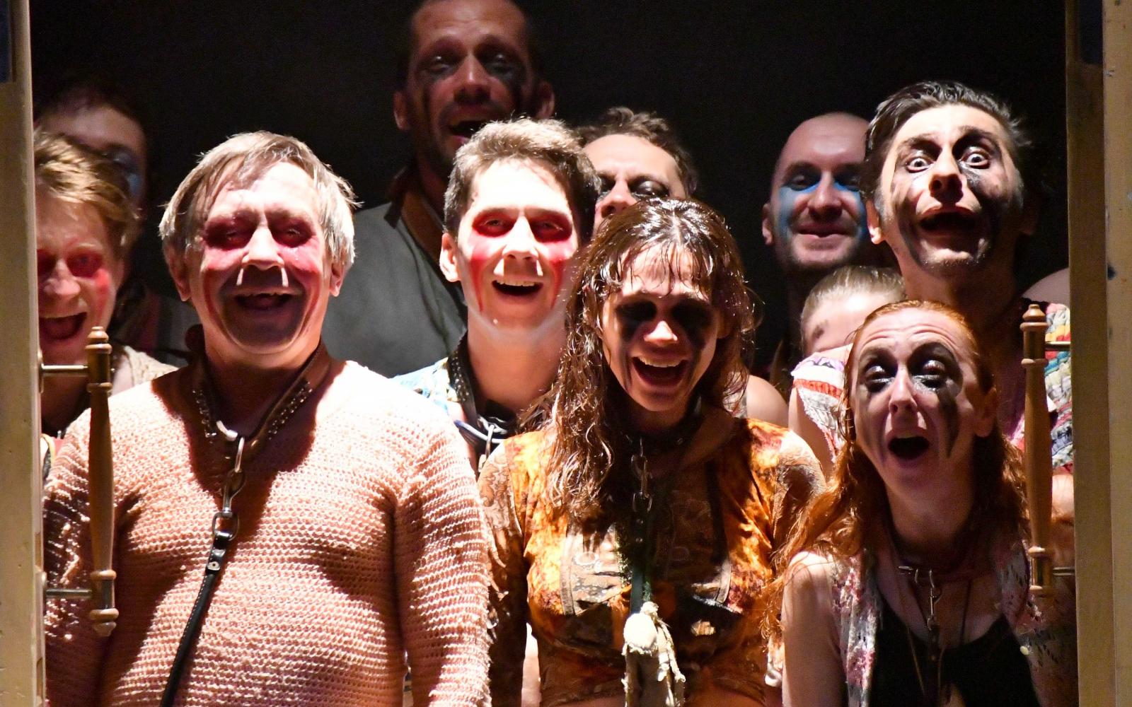 Egyvalaki kivétel. Hamlet atyjának a szelleme, akit, halmozva a funkciókat, Kolyada alakít. Ő rendszeresen megjelenik, angyalszárnyakkal ott bolyong az elvadult tömeghisztériában, és átható nézéssel, megvető pillantásokkal véleményezi az eseményeket. Dermesztő, amit lát. Nevezhető akár elszabadult haláltáncnak is. Mintha egy Bosch festményt látnánk, szörnyalakokká torzult emberekkel.