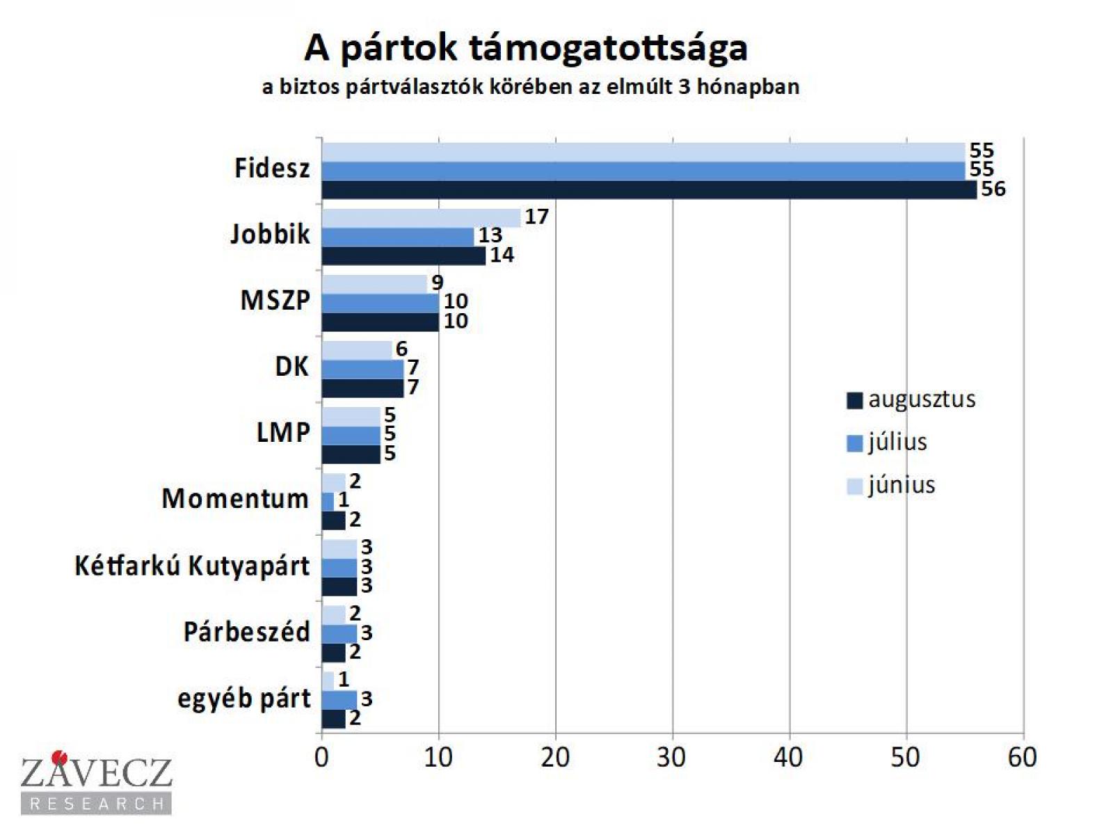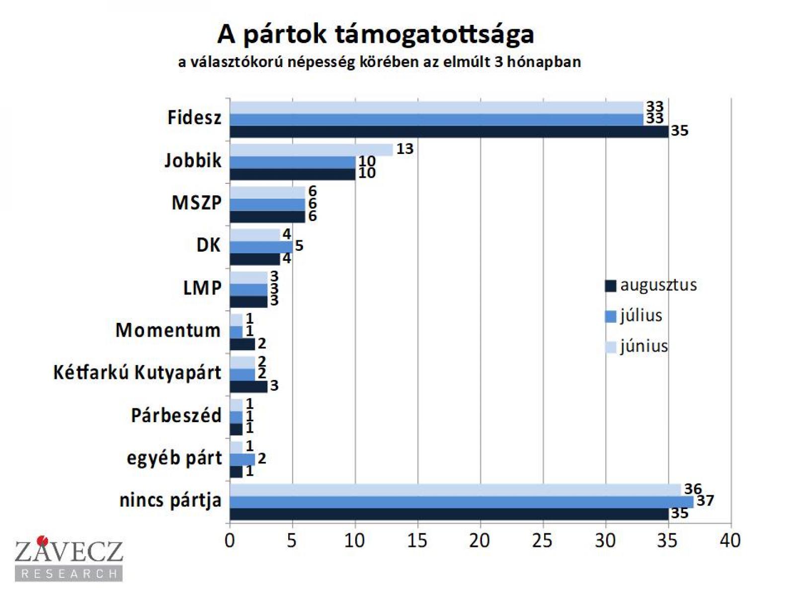 A Fidesz támogatottsága a választások óta stabilan 33 százalék volt a teljes, választókorú népesség körében, de augusztusban ez tovább nőtt, 35 százalékra. A biztos pártválasztók körében a Fidesz-KDNP 56 százalékon áll.