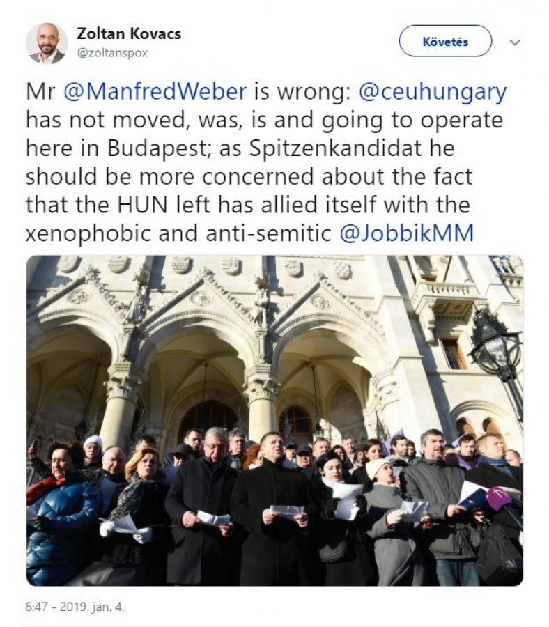 Kovács Zoltán most kijelentette, hogy a CEU nem ment el Magyarországról és a továbbiakban is Budapesten fog üzemelni. Szerinte az EPP csúcsjelöltjének inkább amiatt kellene aggódnia, hogy a baloldali pártok összeszövetkeztek a „xenofób és antiszemita” Jobbikkal.