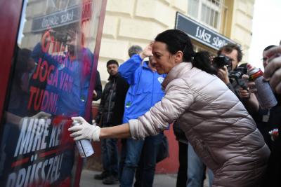 Akciózik az ellenzék: miután bejelentették, hogy a parlamenti ülésnap helyett a nyugdíjfolyósítóhoz vonulnak, menet közben a kormány Brüsszel ellen uszító plakátjait fújják le a XIII. kerületben.