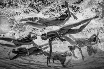 Az AFP fotóriporterei nem csak a szokásos hírképeket készítették el a kvangdzsui vizes vb-n, hanem fekete fehér, művészi igényű fotók is készültek a bajnokság leglátványosabb részéről, a műúszó számokról.