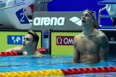 Világcsúccsal nyert a 4x100 méteres amerikai vegyes gyorsváltóA 4x100 méteres amerikai vegyes gyorsváltó világcsúccsal nyert szombaton. A Caeleb Dressel, Zach Apple, Mallory Comerford, Simone Manuel összeállítású kvartett 3:19.40 perccel ért célba, megjavítva ezzel a Duna Arénában két éve felállított 3:19.60 perces idejét. A magyar fővárosban egyetlen eltéréssel ugyanez volt az amerikaiak összeállítása, akkor Apple helyett Nathan Adrian szerepelt a stafétában. Eredmény: 4x100 m vegyes gyorsváltó, világbajnok: Egyesült Államok (Caeleb Dressel, Zach Apple, Mallory Comerford, Simone Manuel) 3:19.40 - világcsúcs 2. Ausztrália (Kyle Chalmers, Clyde Lewis, Emma McKeon, Bronte Campbell) 3:19.97 3. Franciaország (Clément Mignon, Mehdy Metella, Charlotte Bonnet, Marie Wattel) 3:22.11
