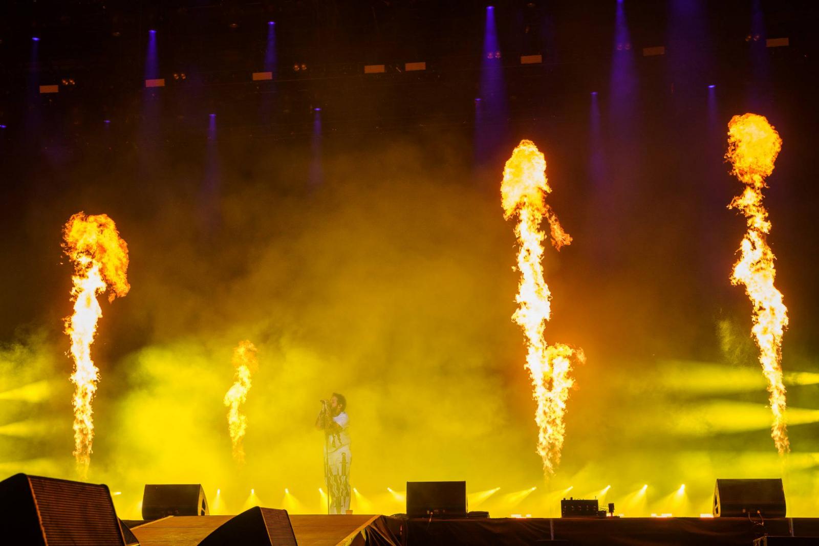 A strassz kövekkel díszített necc topot, rövidgatyát és bakancsot viselő, nem mellesleg egészen bájos, szeretni való énekes fiú zenekarának jól átgondolt látvány és hangzásvilága a maga lépcsős színpadával, és vokalista duójával utólag már-már giccsesnek tűnt a világoskék pizsama szerű ruhában, mindössze italával kezében színpadra lépő énekeshez képest. A körítés azért itt sem maradt el teljesen, hiszen a fényjáték mellett görögtűz elemekkel is megspékelték az előadást, noha a széttetovált arcáról ismert ifjú önmagában, mindössze jelenlétével is teljesen megtöltötte az irdatlan teret. Egészen meglepő erővel uralta a színpadi energiákat, de ebben alighanem közönsége is segítségére volt, akik látszólag, az elsőtől az utolsóig a koncert minden pillanatát imádták.