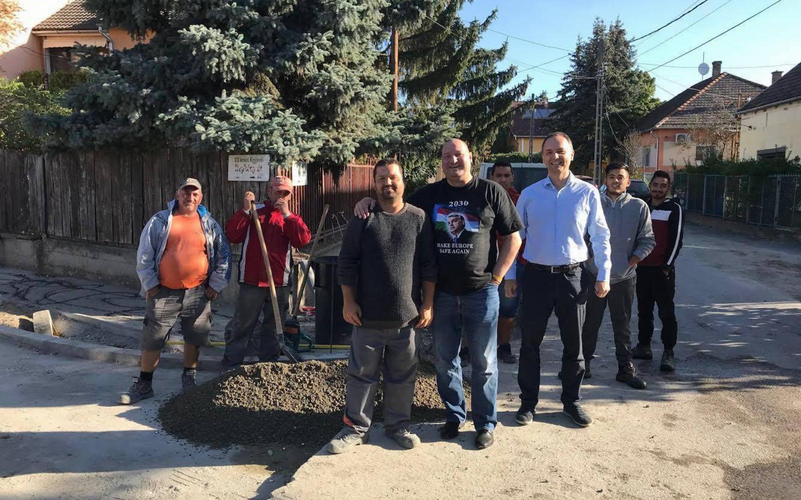 A pólót egy kampánybejáráshoz vette fel a csepeli Fidesznek akciózó államtitkár, aki látogatást tett egy csepeli nőgyógyásznál és egy Repkény úti építkezésen is pózolt a munkásokkal.