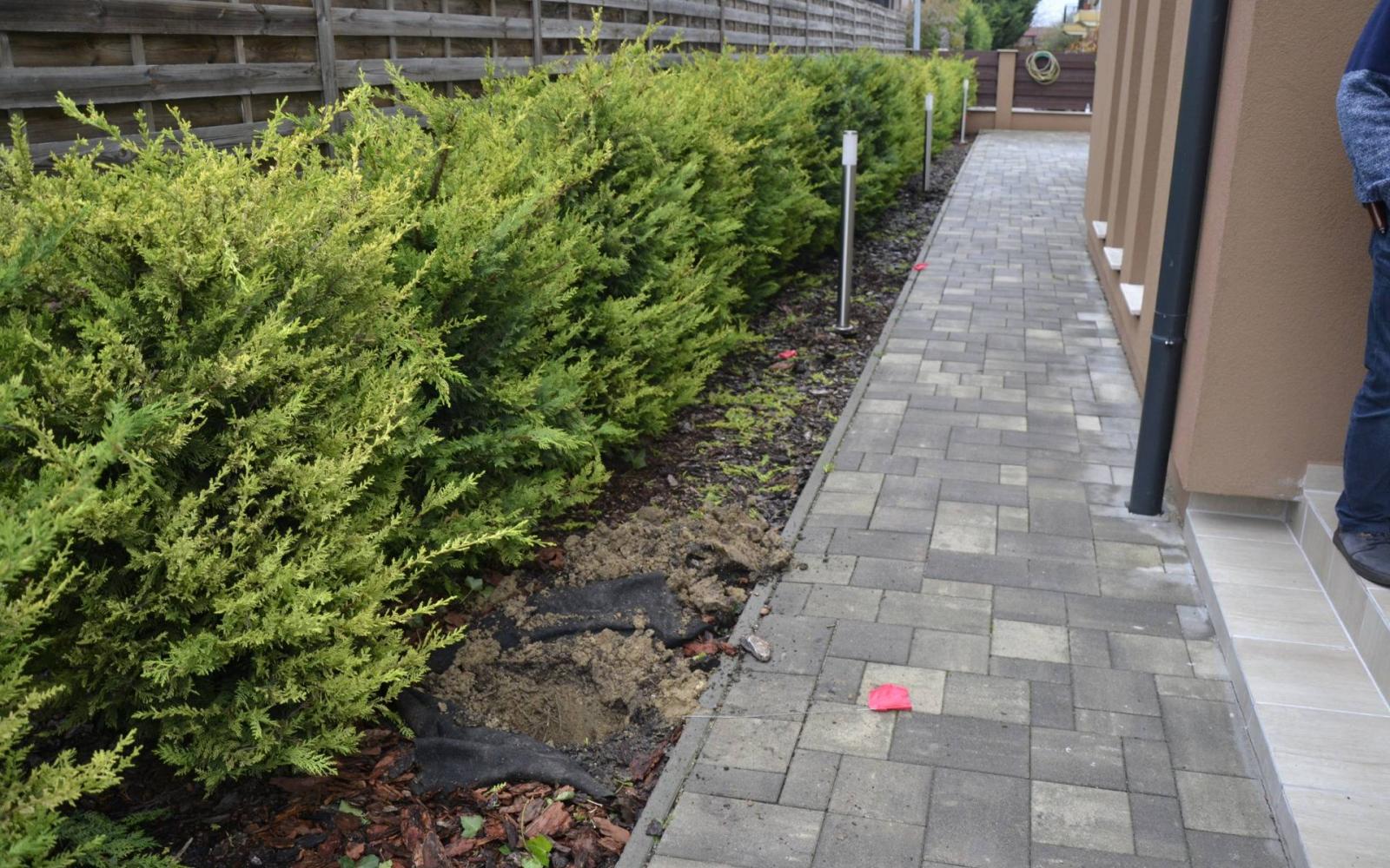 A nyomozók az ingatlanhoz tartozó kertet is alaposan átvizsgálták. Eközben a kutatásban résztvevő bűnügyi technikus a kerti bokrok tövében korábbi talajmozgatás nyomaira bukkant, amelyet a férfi elmondása szerint kutyája ásott fel. Több ilyen – kutya által felásott – részt is megvizsgáltak a rendőrök, de mindegyik üresnek bizonyult.