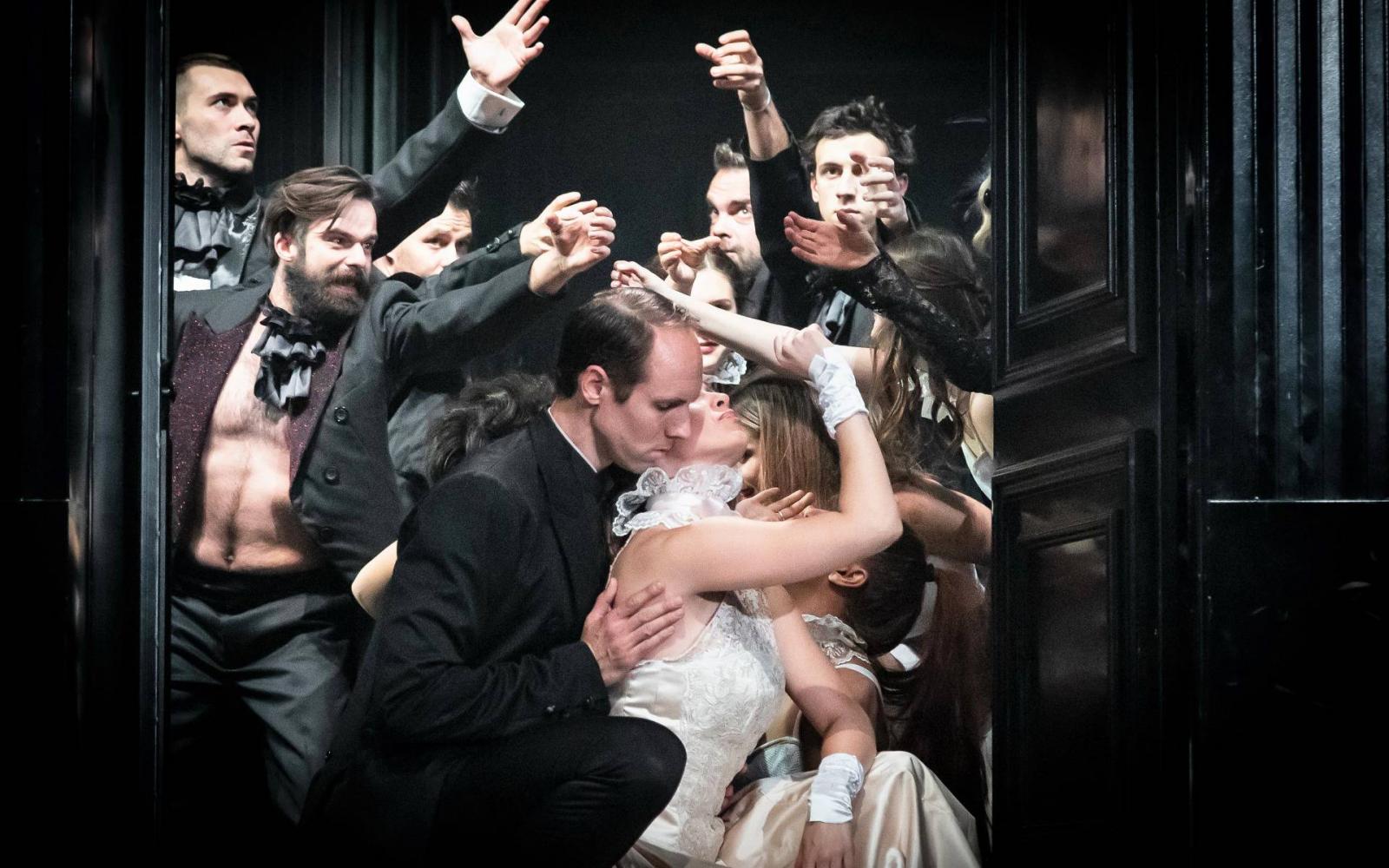 Ráadásul a rendező végig keveri a nyerset, a fizikailag fájót a szelíden simogató érintésekkel. A színre vivőt elsősorban a viszonyok érdeklik, a találkozások, a lángolások, a csalódások és a kiábrándulások. És mer szentimentális lenni, mindezt úgy, hogy az érzelmesség nem csordul túl, vagy tárgyiasul, máskor humorral itatódik át. Ez utóbbi történik például, amikor Levin (Pongó Gábor) és Kitty (Dienes Blanka) elkezdenek egymásra licitálva mindenre, falra, tárgyakra felírni valamit. Főként azt, hogy szeretlek!