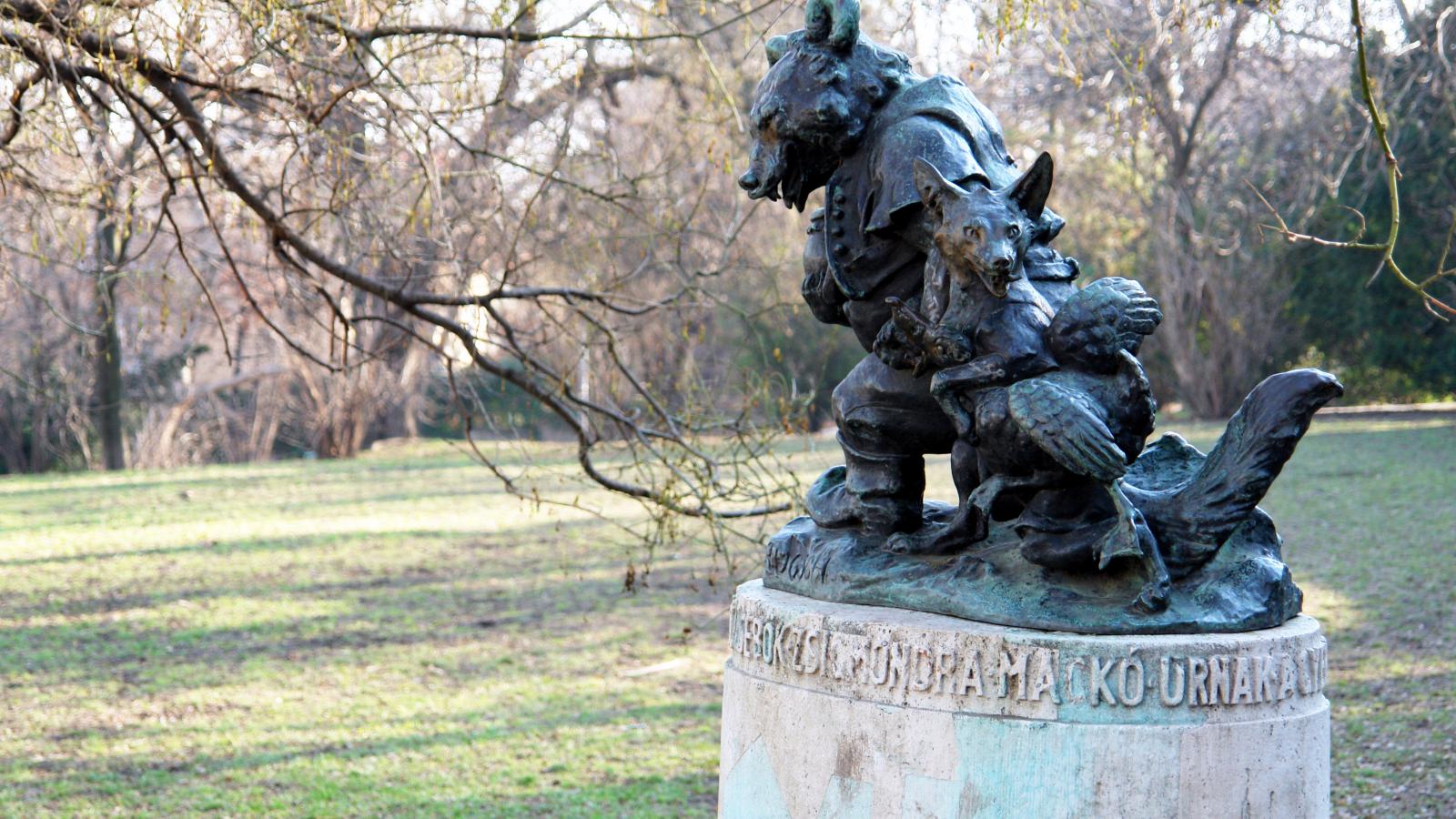 Sebők Zsigmond írja az egyik legendás meséjében, hogy mivel a mackó uraknak télen nem kell elemózsia, hiszen az időt ilyenkor többnyire alvással töltik, a mackóiskola ajtajára, miheztartás végett, kiakasztják az említett hirdetést. Persze így az új NAT árnyékában az azóta lesikált graffiti egyértelműen többletjelentéssel bír a szó szerinti nemzeti alváshoz képest, és ha csak annyit ér el, hogy az ember előkotorja a nagyi könyvespolcáról, a padlásról vagy a könyvtárból Mackó úr meséit, már többet tett a nemzeti ébresztésért, mint bármelyik, a kánonba újonnan beszavazott kötelező olvasmány. A medvével, és barátjával, Róka Misivel – aki eltéveszthetetlenül kitekert pózban szorongat egy tátogó csőrű libát – egyébként a Várhegy oldalában kvázi személyesen is megismerkedhetünk: ugyanaz a Maugsch Gyula követte el, aki az Izabella és az Alsó erdősor utca ipszilonjában álldogáló bronzdog-szobrot, Dr. Foolt is készítette. Az 1936-os medvealkotás, Mackó úrfi Róka komával, eredetileg a Margit-híd budai hídfőjénél, a Lukács fürdő háta mögött, az akkor még felszínen lévő HÉV-megállóval szemben kapott helyet, de aztán 1970-ben átkerült a Várhegy oldalába, az Európa ligetbe. Talán Mackó Muki (merthogy ez a becsületes neve Mackó úrnak) és Róka Misi jobban is érzik magukat a zöld bozótosban, mégis csak egy máramarosi erdőbirtokos és méztermelő medvéről van szó, szabad kezében minden medvék legfőbb attribútumával, a mézes bödönnel.