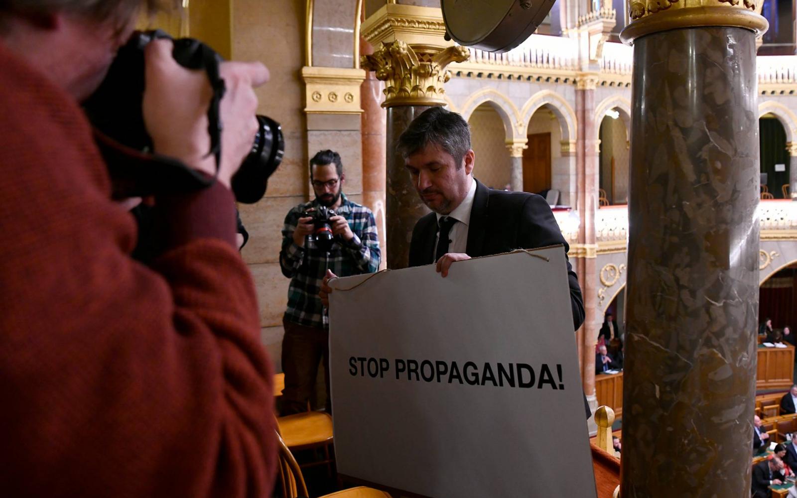 Schandta Tamás éppen arról beszélt, hogy szerinte is jó lenne, ha lennének olyan témák, amelyekre közösen lehet büszke a kormány és az ellenzék, amikor Hadházy Ákos egy Stop propaganda feliratú táblát lógatott Kövér László feje fölé. Az akció felhördülést váltott ki, a házelnök kitiltotta a független képviselőt a teremből és közölte, hogy a későbbi büntetéséről tájékoztatja a házbizottságot.