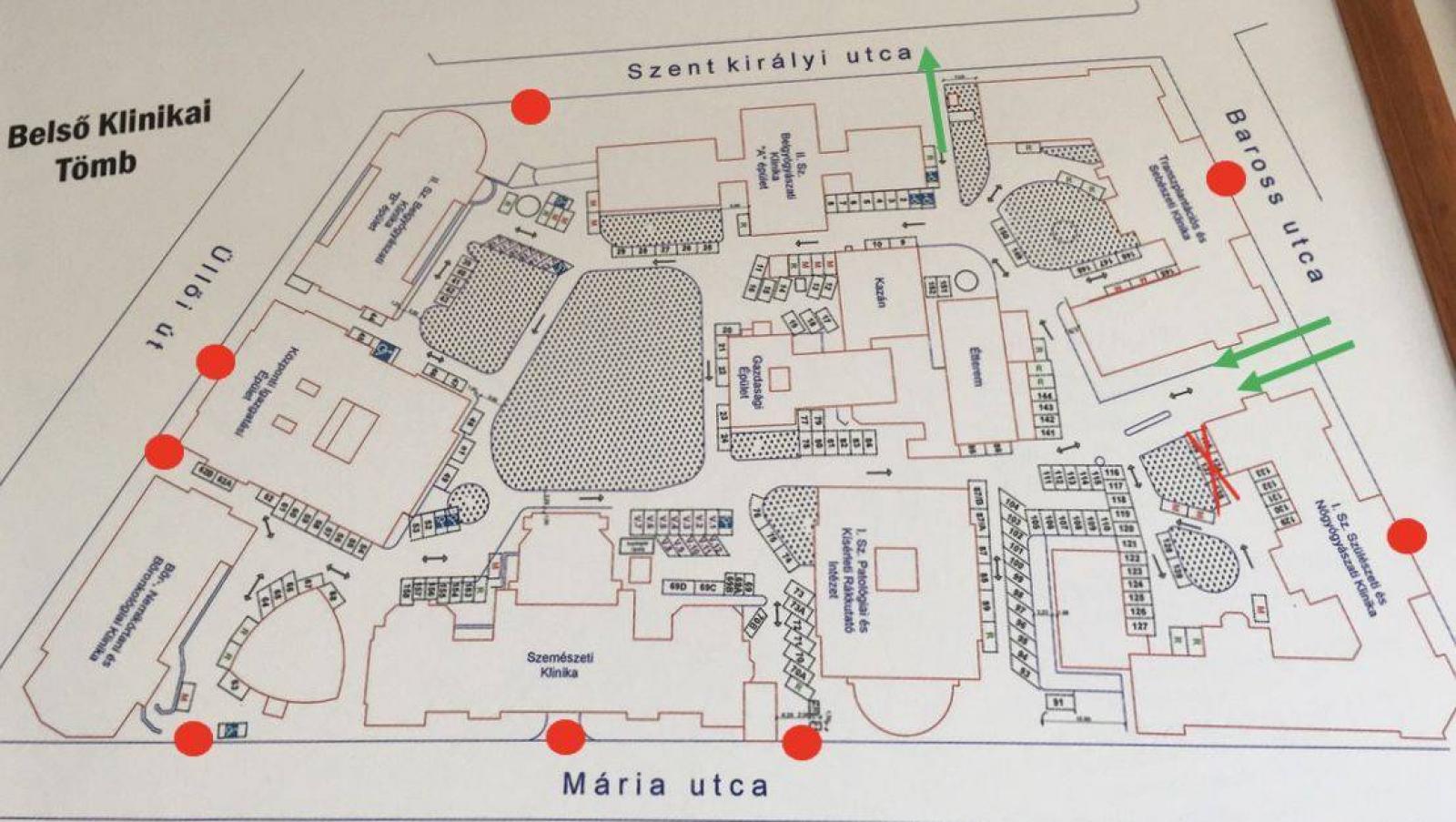 A Belső Klinikai Tömb területének és az ott található klinikáknak minden utcai bejáratát bezárják néhány kivétellel. A nem előjegyzett betegek gyalogosan a Baross utcai kapun léphetnek be a tömb területére, míg az előjegyzéssel rendelkező betegek az adott klinika portáján, amely csak számukra és a gyalogosan érkező munkatársaknak nyitott. Mindkét esetben az említett kérdéseket és hőmérést követően lehetséges csak a belépés.