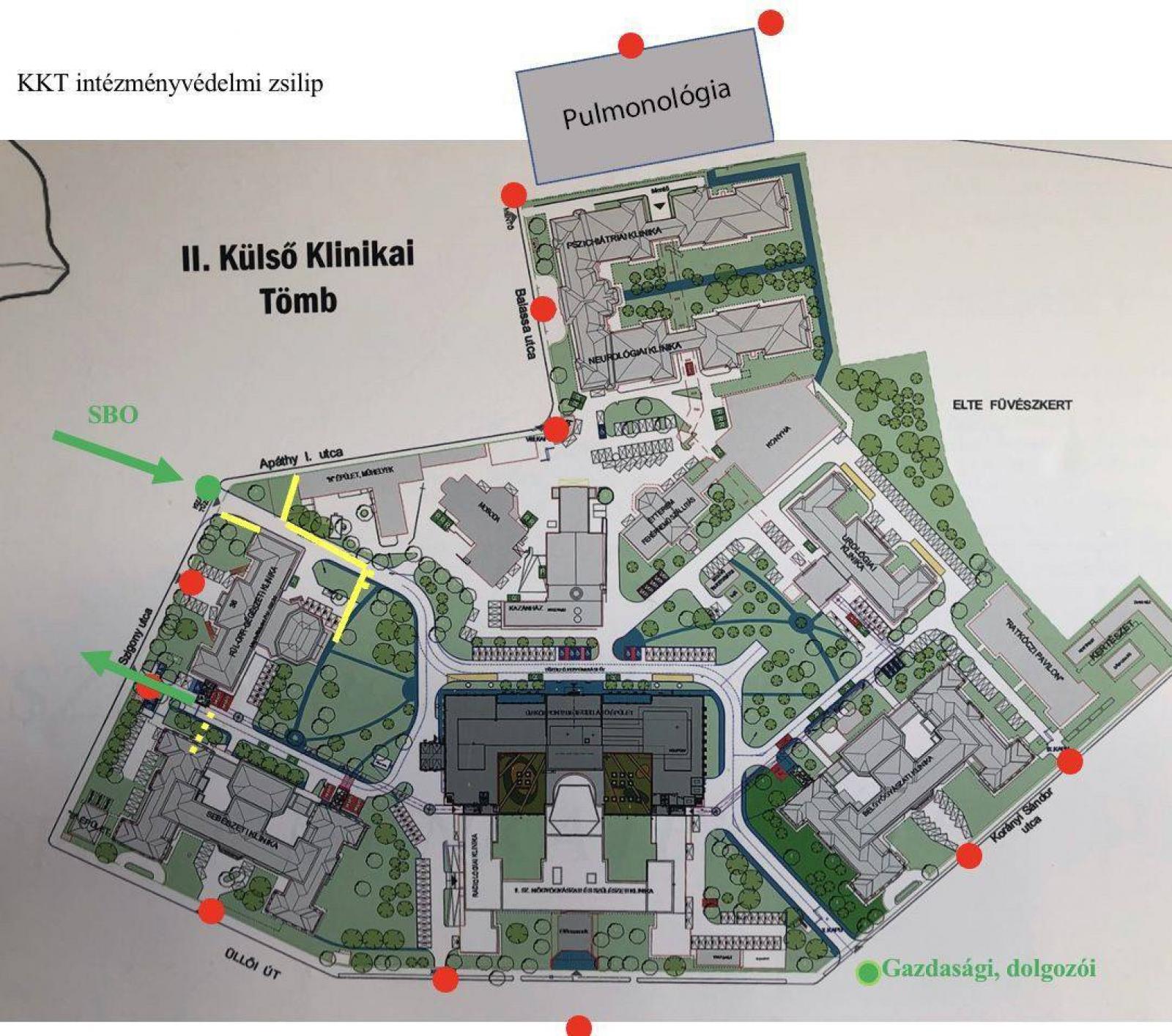 A Semmelweis Klinikák metróállomásnál található Külső Klinikai Tömbnek (KKT) minden utcai bejáratát lezárják, kivéve a beléptetőpontokat. A Sürgősségi Betegellátó Osztályra (SBO) érkező és a nem előjegyzett betegek az ún. Tűzoltókapun (Szigony utca – Apáthy utca sarok) érkezhetnek, míg az előjegyzett betegek a klinikai portákon keresztül (kivéve az Urológiai Klinika betegeit, akik a X-es kapun léphetnek be), szintén kikérdezést és hőmérést követően.