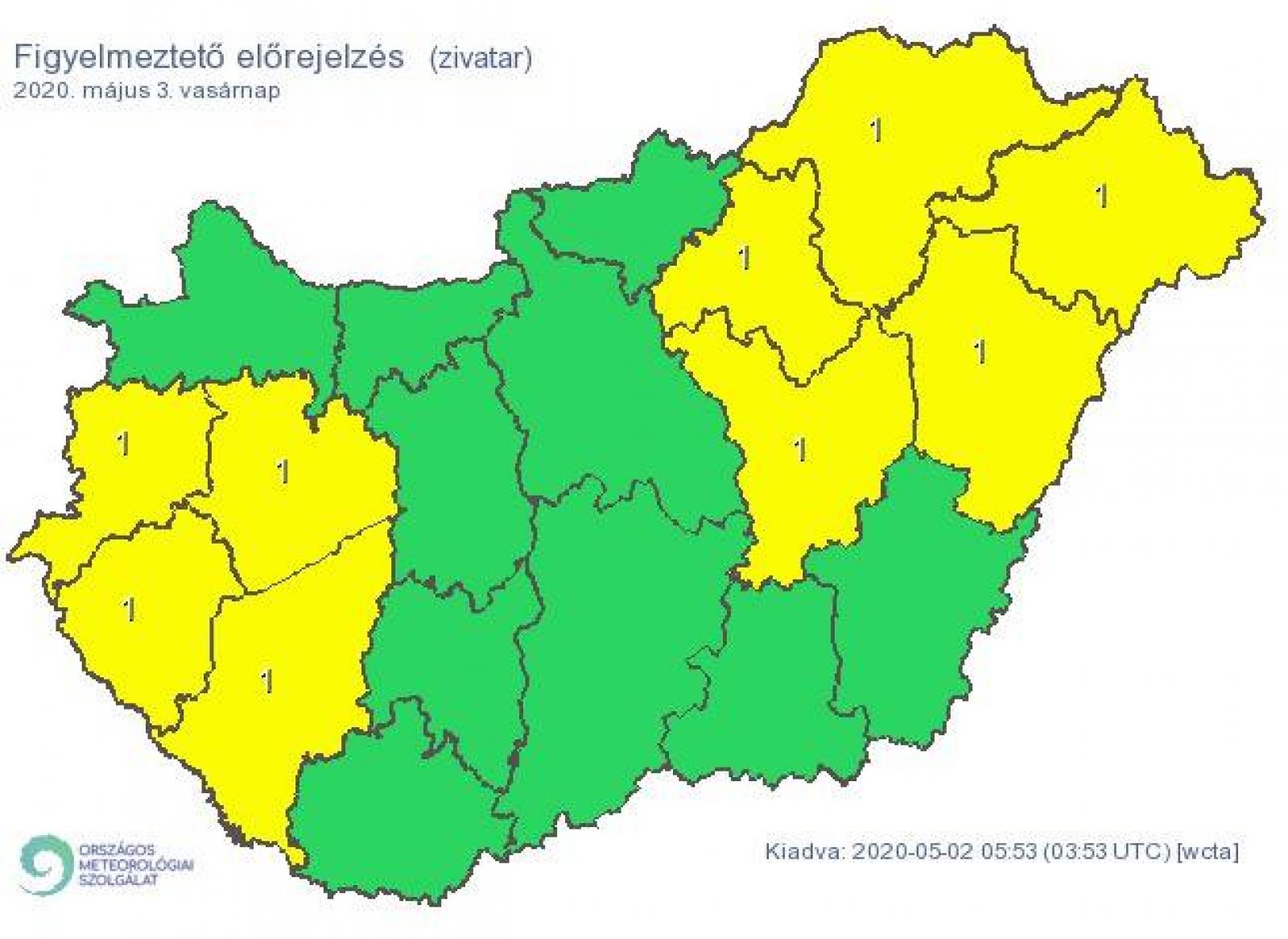 A zivatarok veszélye miatt Borsod-Abaúj-Zemplén, Hajdú-Bihar, Heves, Somogy, Szabolcs-Szatmár-Bereg, Jász-Nagykun-Szolnok, Vas, Veszprém és Zala megyére is elsőfokú figyelmeztetést adtak ki.