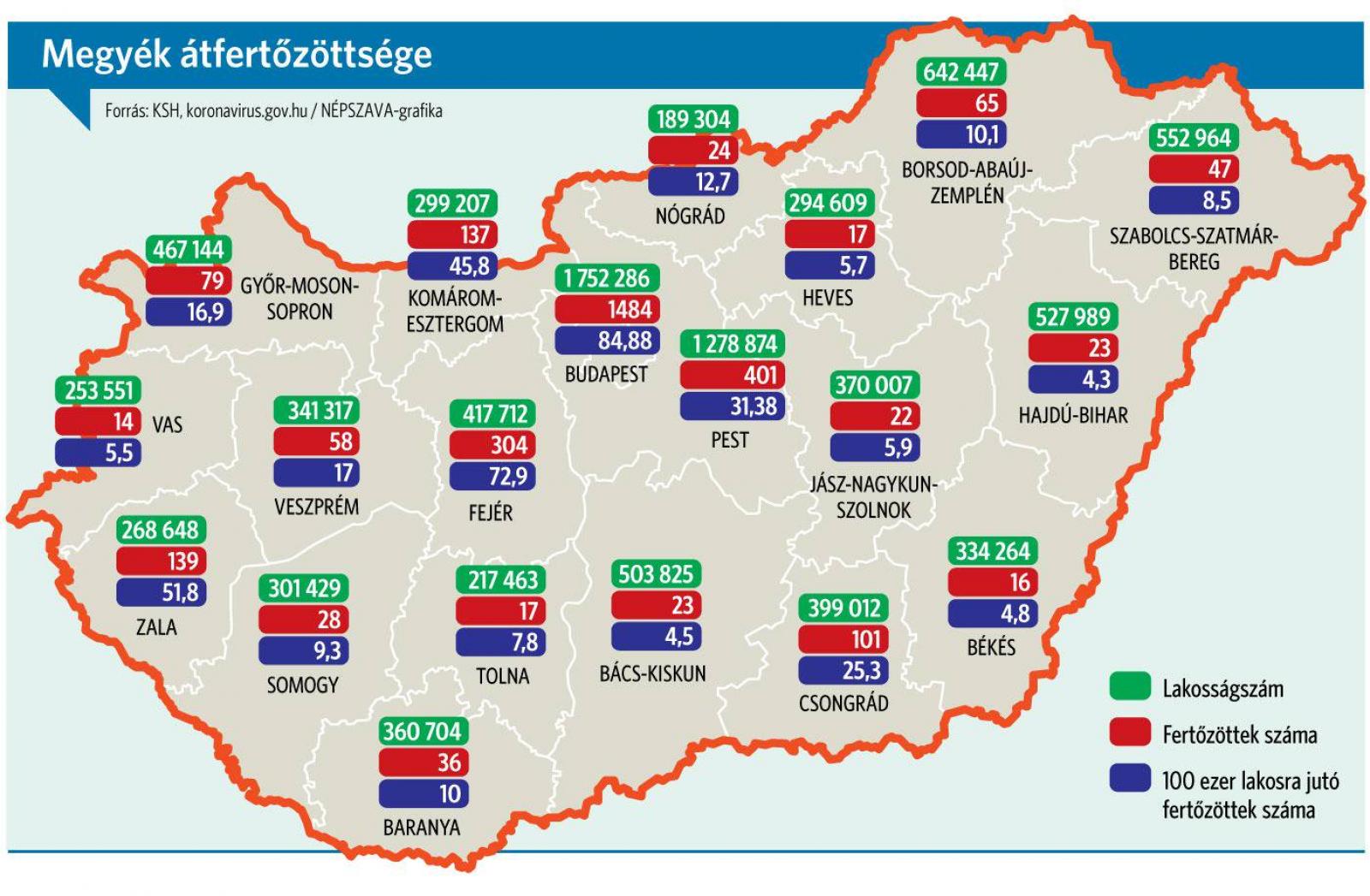 A fővárosban és Pest megyében az összesen több mint 3 millió lakosra 1885 fertőzött jut, vagyis ezer főből átlagosan 62-en fertőződtek meg, míg például a 417 ezres lakosú Fejér megyében ez az arány 72. Ha külön vizsgáljuk Budapestet, ez az érték a főváros esetében 84-re emelkedik, de Pest megyére vetítve már csak 31 fertőzöttet mutat. Tehát még Komárom-Esztergom (45 fertőzött ezer lakosra) és Zala megye (51 fertőzött ezer lakosra) is megelőzi Pest megyét átfertőzöttségben. A szakértők ugyanakkor figyelembe veszik a népsűrűségi adatokat is. Budapesten érthető módon a legmagasabb ez a szám (3377 fő egy négyzetkilométeren), tehát itt a legnehezebb elkerülni a társadalmi érintkezést. Pest megye népsűrűsége is relatív magas, 200 fő él átlagosan egy négyzetkilométeren. Noha Fejér megyében fele annyian laknak átlagosan ugyanakkora területen (96 fő), de a megye átfertőzöttsége kétszer nagyobb, mint Pesté.
