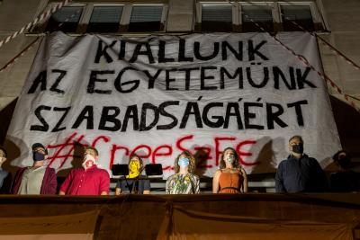 Az egyetemfoglalók képviseletében hozzáteszi: „Ha akarnánk sem lehetnénk egyszerre két helyen. Hallgatók nélkül nincs oktatás, a hallgatók pedig itt vannak a Vas utcában.” Mint mondja, az SZFE szeptember 14-én elkezdte a félévet: „a tanköztársaság keretén belül, az elfoglalt épületben a blokád szervezése mellett tanórák és kurzusok zajlanak”.