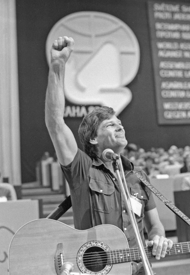 Emlékezetes akciója volt, amikor Santiago de Chilében, az amerikai konzulátus előtti tüntetésen kimosta a csillagos-sávos zászlót, hogy „megtisztítsa az imperializmus szennyétől”. Támogatta Salvador Allende választási kampányát. Libanonban a palesztin gerillavezérnek, Jasszer Arafatnak énekelt. Csak odahaza nem járt sikerrel akkor sem, amikor a tiltakozó minnesotai farmerekkel fejezte ki szolidaritását (1978). Lecsukták; a fogdában éhségsztrájkot kezdett, mire a vasfüggönyön innen – gyaníthatóan nem egészen spontán – mozgalom alakult szabadon bocsátásáért.