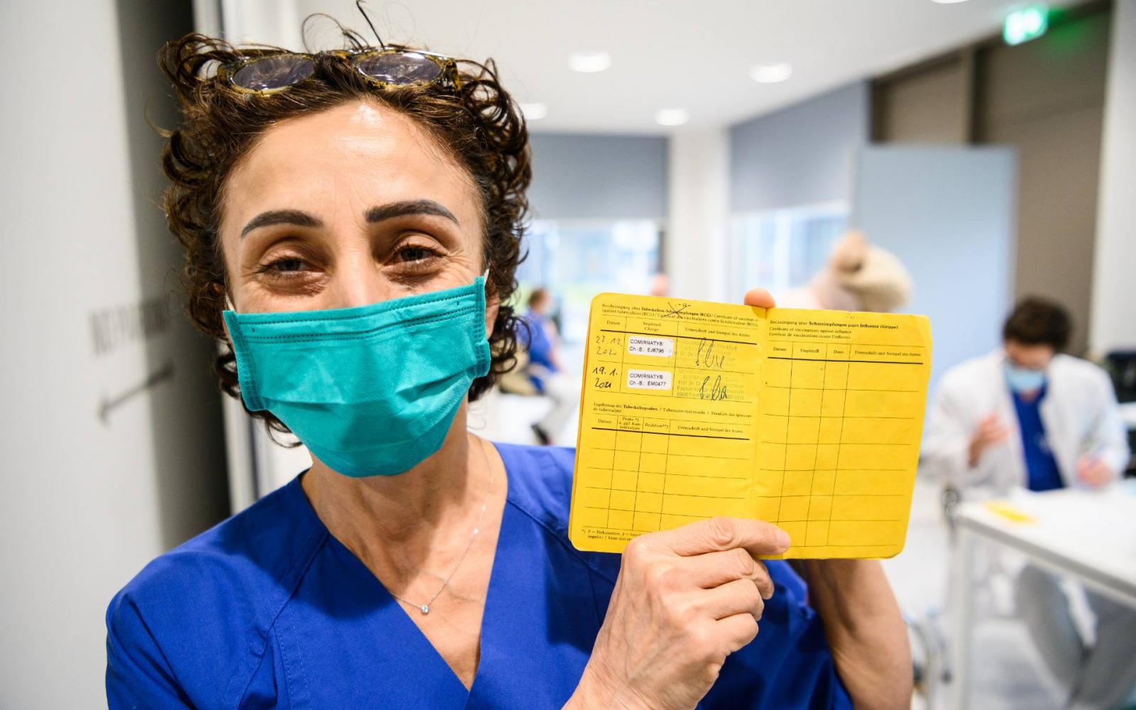 A cikképen Zeynep Kallmayer, a frankfurti egyetemi kórház ápolója mutatja az oltási könyvét a második védőoltás után.