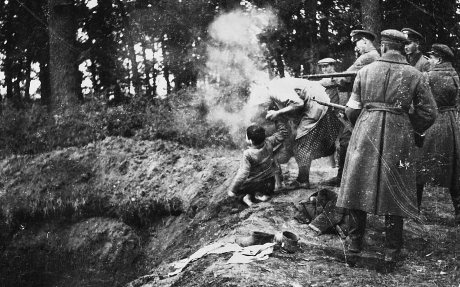 A fénykép egy ukrajnai kisvárosban, Miropolban, nyolcvan évvel ezelőtt, 1941. október 13-án készült. Abban az időben, amikor a Szovjetuniót lerohanó hitleri seregek nyomában a náci halálkommandók módszeresen legyilkolták az ellenségnek kikiáltott zsidó lakosságot. Korra, nemre való tekintet nélkül, nem egyszer lelkes helyi kollaborációval. A most közreadott fotó a gyilkolásnak azt a mozzanatát rögzíti, amikor a női áldozat előredől, fejét a minden bizonnyal a puskacsövekből kicsapódó lőporfüst eltakarja. Ahogy a sírgödör szélén meggörnyed, egy térdre esett, mezítlábas fiúcska kezét szorongatja, akinek arcát ugyancsak nem látni, talán rémületében, éppen a kameragomb lenyomásának minutában félrefordítja tekintetét. Közvetlenül az áldozatok mögött áll a kivégzőosztag, a sortüzet leadó három ukrán milicista. Mellettük feltűnik két egyenruhás német, kicsit odébb pedig még egy micisapkás civil is. De miért hajol annyira előre a női áldozat? – tanakodhattak a fotót elemző washingtoni Holokauszt Emlékmúzeum szakemberei. Nagyítás után vált láthatóvá: a pöttyös szoknya redőiben még egy gyermek rejtőzik. Hárman egyszerre, együtt zuhannak a tömegsírba.