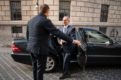 A pápa ezután a Szépművészeti Múzeumba megy, ahol háromnegyed 9-kor találkozik Áder János köztársasági elnökkel és Orbán Viktor miniszterelnökkel, akik „fél órát kaptak” a katolikus egyházfőtől.