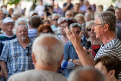 A Telex szerint az egybegyűltekhez először Kovács Gergő pártelnök, XII. kerületi önkormányzati képviselő beszélt, aki azzal kezdte, a villamossínen vigyázzanak az emberek, eddig „max tíz halottat jelentettek”. Október 23. egy nagy közös érzés, amiről minden magyarnak ugyanaz jut az eszébe: Gyurcsány. Minden ellenzéki mögött ő áll, mögötte meg egy 10 méteres Megagyurcsány – mondta, majd Orbánt kifigurázva arról beszélt, „tető kell az ország fölé, nehogy onnan jöjjenek a migránsok”. Szóba hozta a nyári megfigyelési botrányt is: az App Store-ból töltse le mindenki a Pegasust, mostantól elérhető. Előre tovább a putyini úton! – zárta beszédét, amelyet több kutyapárti felszólaló is követett.