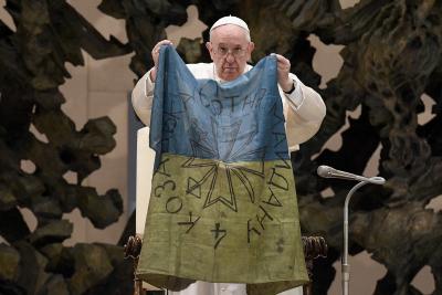 A katolikus egyházfő erről szóló beszédében egy Bucsából küldött, megtépázott ukrán zászlót tartott a magasba.