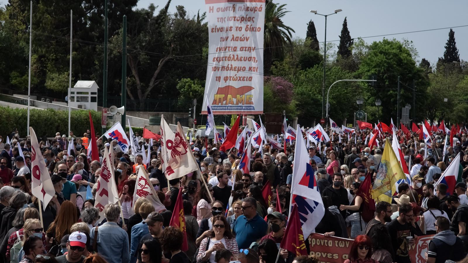 Leálltak a metrószerelvények, a hajók pedig a kikötőkben vesztegeltek a görög fővárosban, miközben több ezer munkavállaló csatlakozott a május elsejei tüntetésekhez, így demonstrálva az energia- és élelmiszerárak emelkedése ellen - tudósít a Reuters.