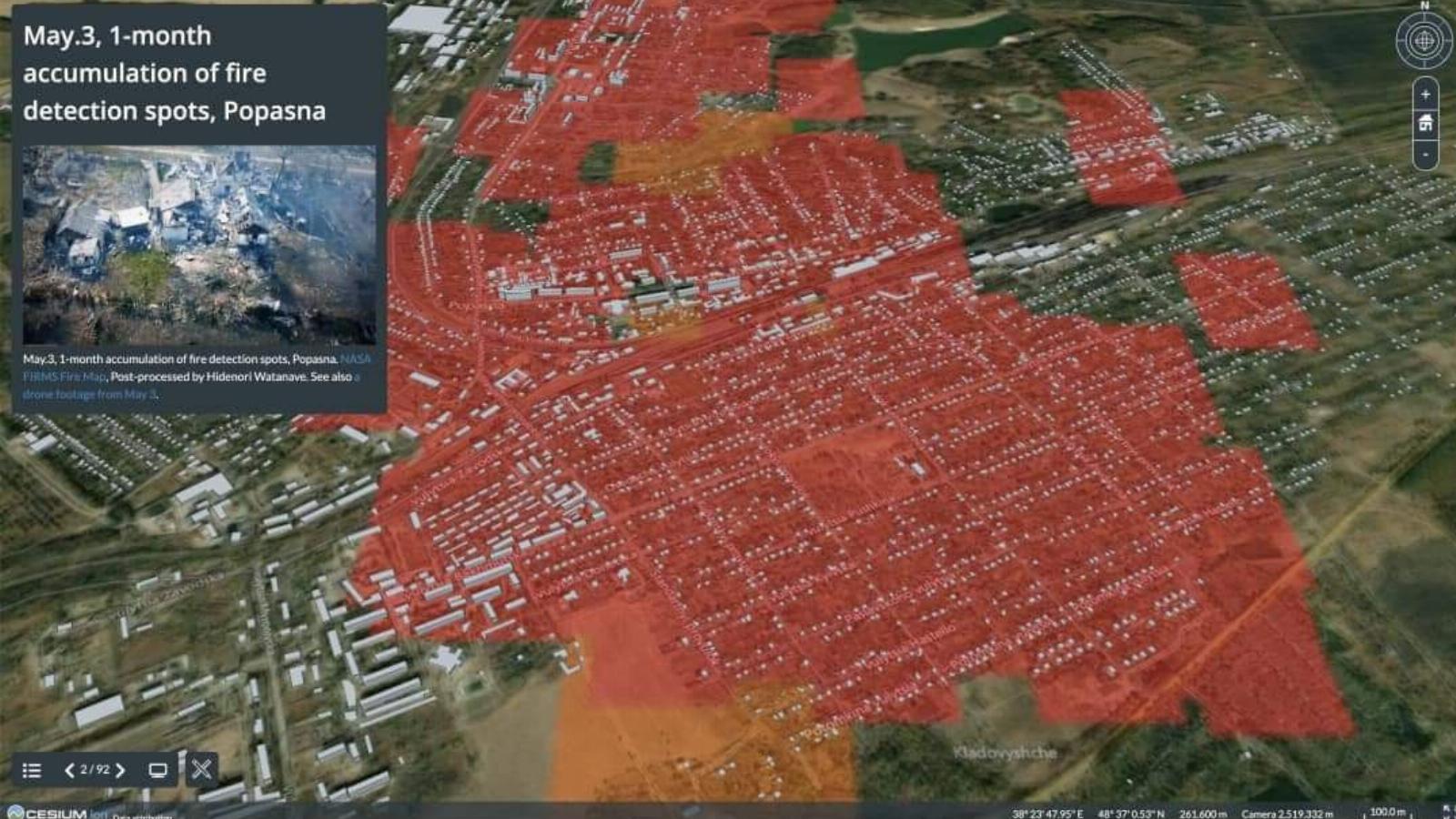 A képen Popaszna városának műholdképe látható. A jelentősebb robbanásokat és tüzeket pirossal jelzik. Mindebből azt a konzekvenciát lehet levonni, hogy a települést folyamatosan, nagy erővel támadták. Az is tisztán látszik, elsősorban a lakott területen volt tapasztalható mindez.