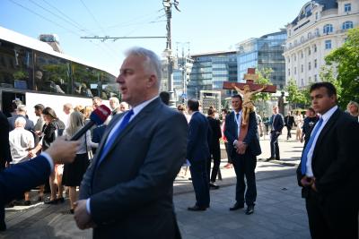 Később arról beszélt, joggal vagyunk büszkék nyelvünk gazdagságára, kultúránk kincseire, vagy éppen viharos történelmünkre. Mi ugyanazok a magyarok vagyunk, akik 48-ban, 56-ban is küzdöttek szabadságunkért. Majd feltette a kérdést, ha ez így van, miért látnak bennünket egyre kevesebben ilyennek a világ azon tájain, ahol egykor kalapot emeltek bátorságunk előtt.