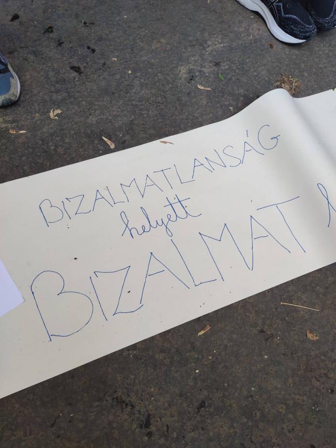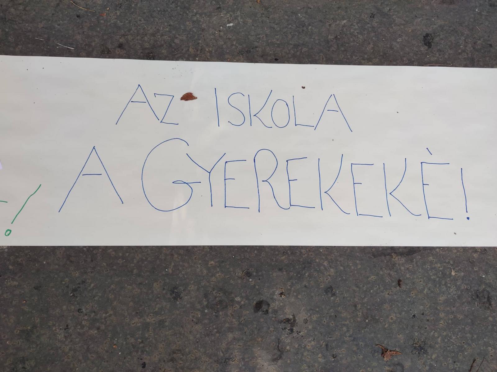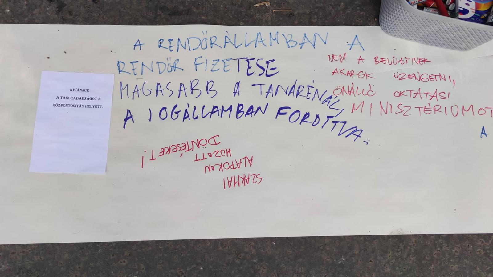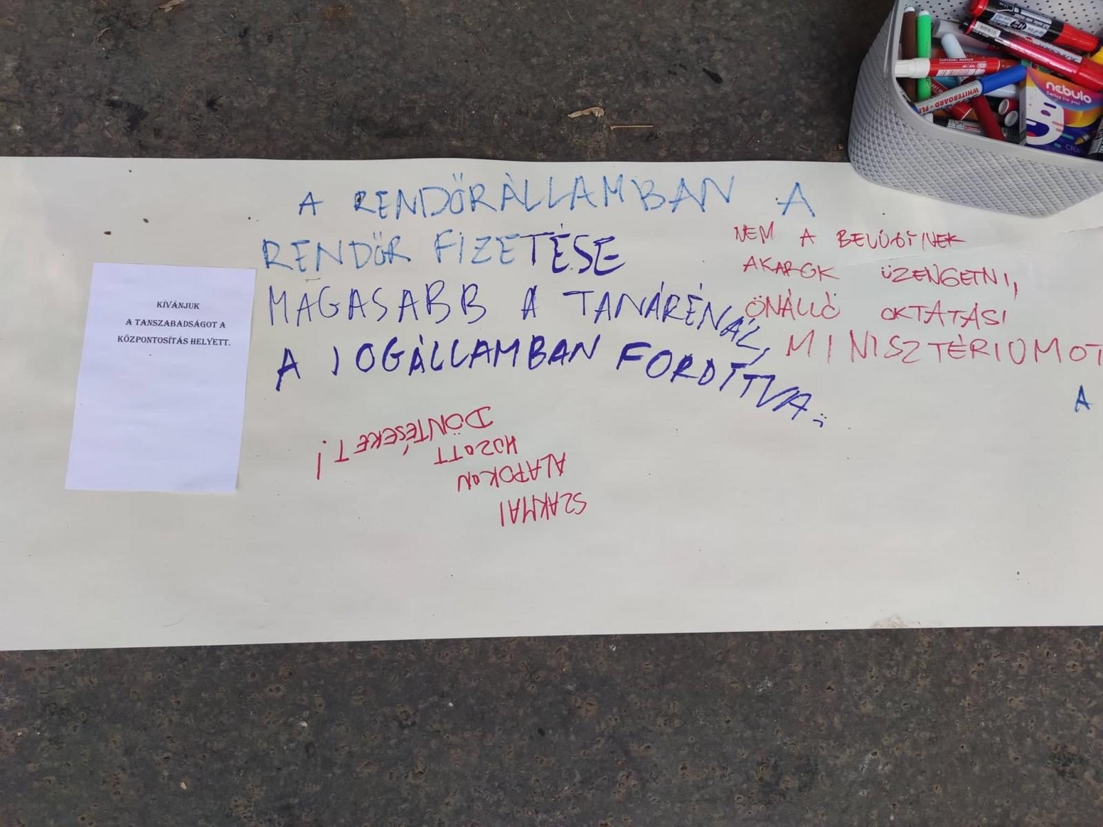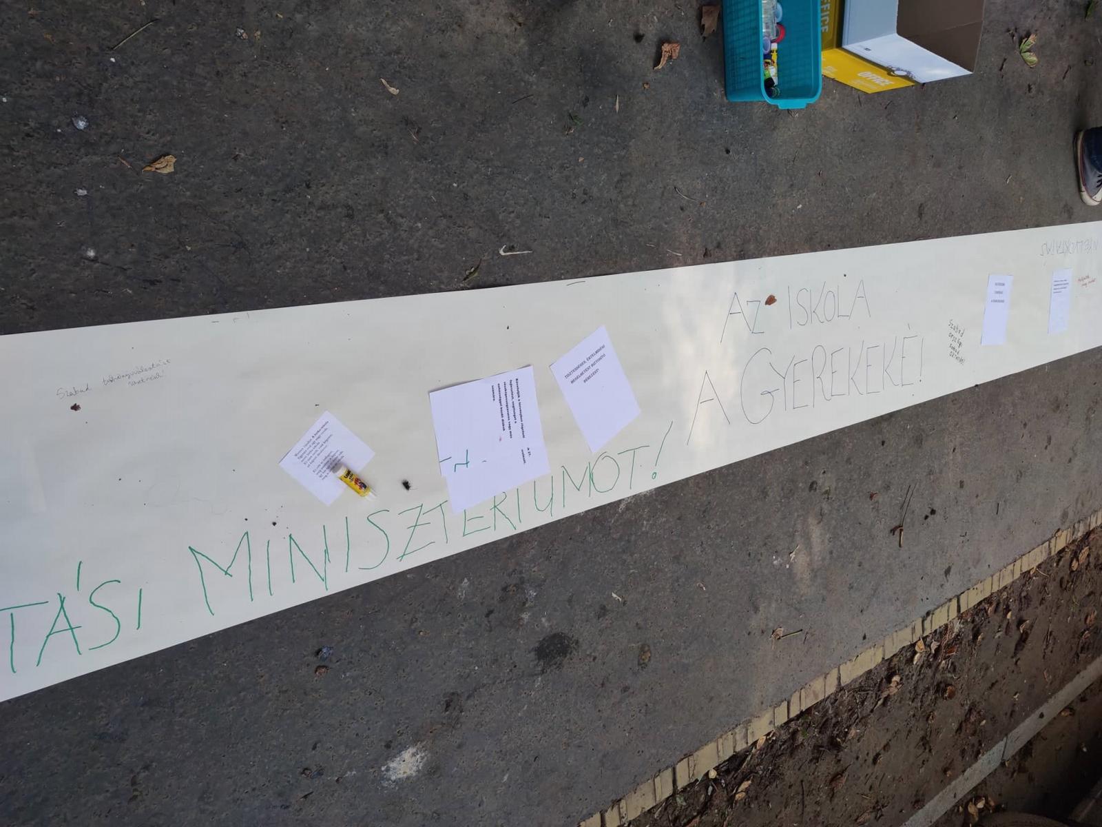 Az ELTE Radnóti Miklós Gyakorló Iskola és a Szent István Gimnázium flashmobbal üzen az oktatásért mostanában felelős tárcának, a Pintér Sándor vezette Belügyminisztériumnak az Abonyi utcában. Hosszú papírra írva lehet üzeneteket küldeni, Weöres Sándortól A birka-iskola a sláger.