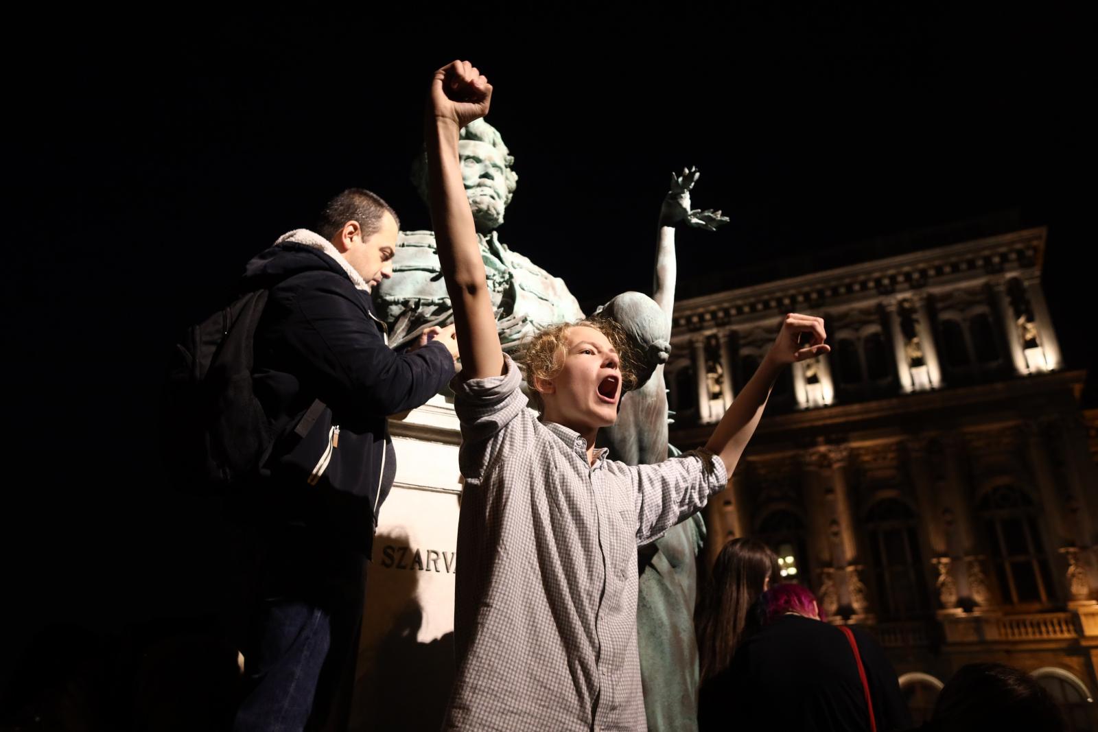 A menet élén haladók már meg is érkeztek ide. „Nincs tanár, nincs jövő!” - hangzik a rigmus. Emellett az „Elegünk van!” is népszerű.