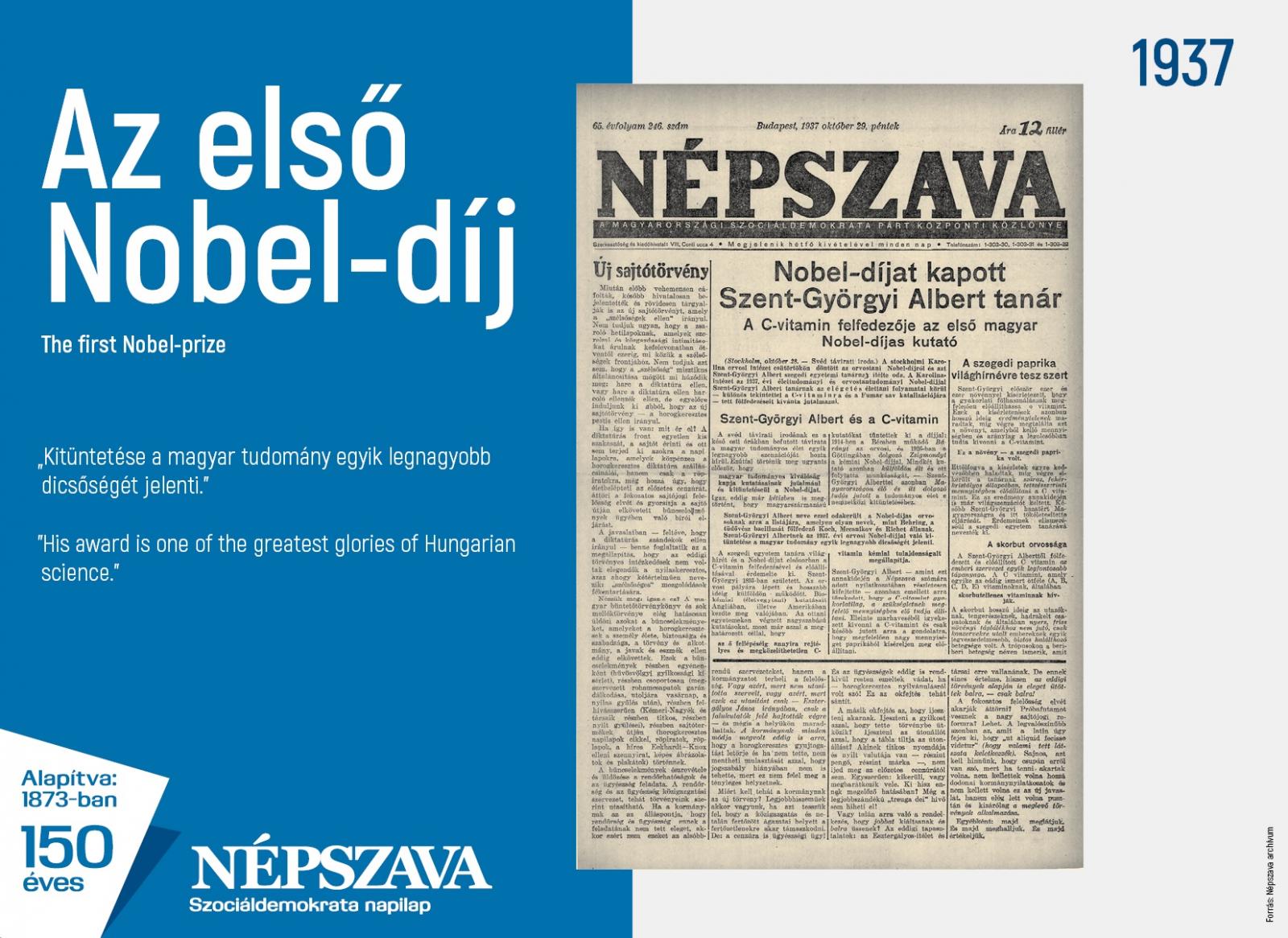 Szent-Györgyi Albert orvos, biokémikus, az első és máig egyetlen magyar kutató, aki Magyarországon végzett munkájáért kapott természettudományos – fiziológiai és orvostudományi – Nobel-díjat.