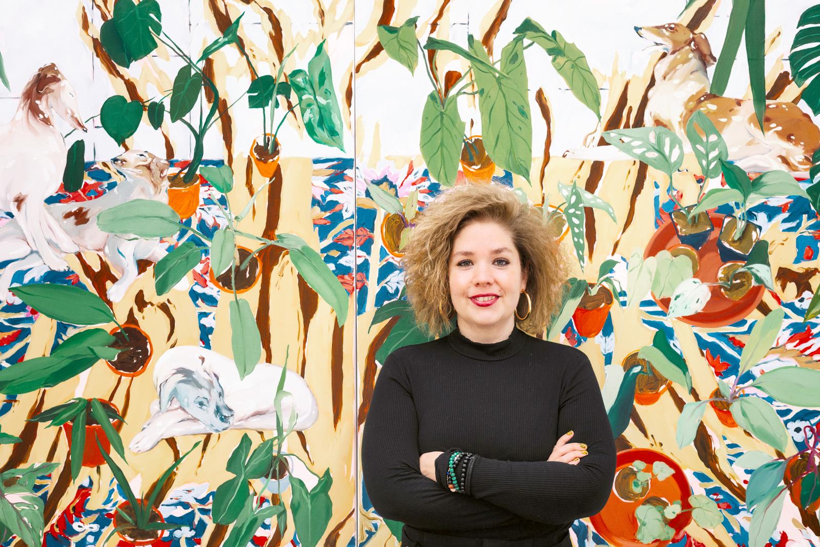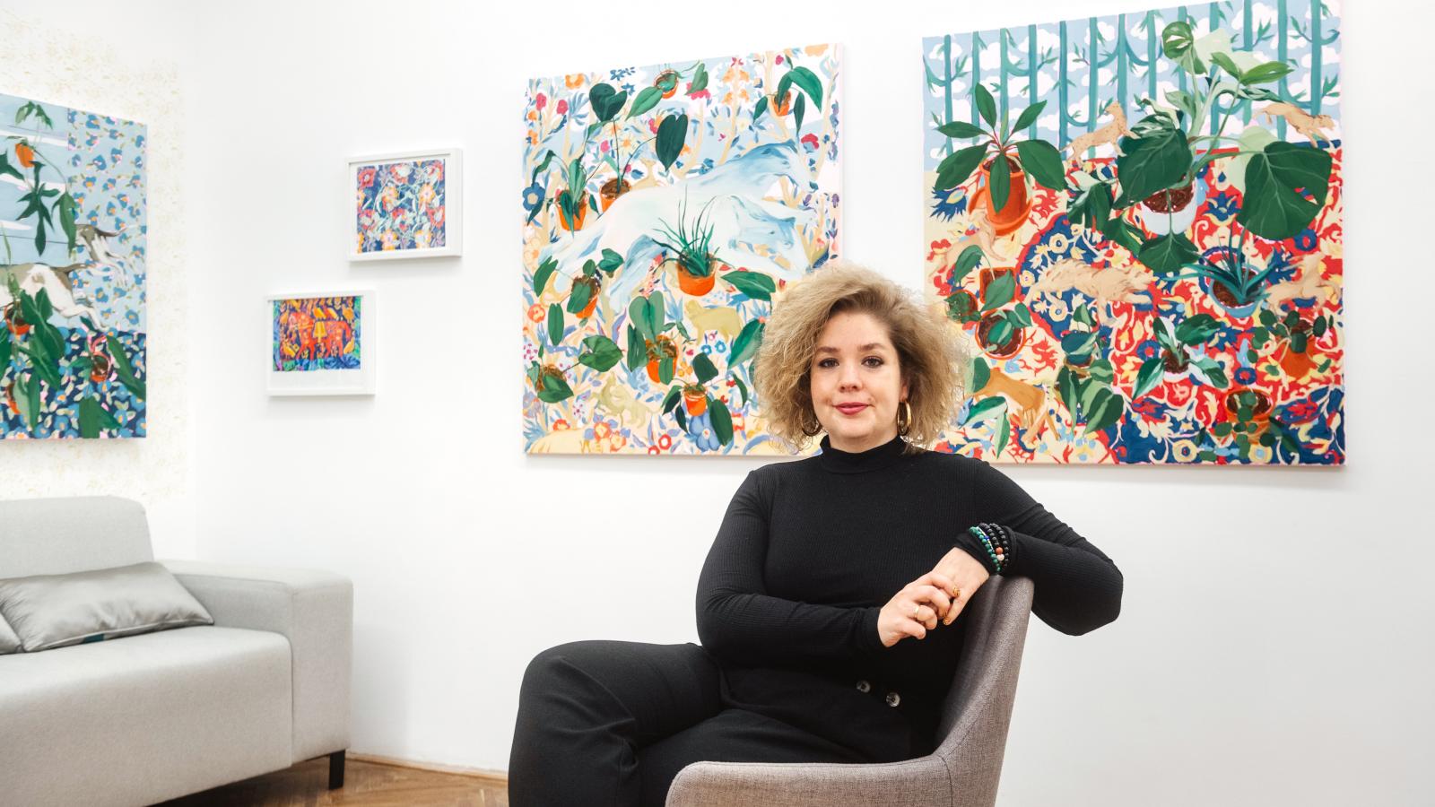 Amikor arról kérdezem Katát, pontosan milyen fajtákat ábrázol, azt mondja, nehéz lenne felsorolni, de sokszor fest elefántfület, nyíllevelet, aloe verát, filodendront, levegőnövényt, begóniát, szobai futókát, madárfészekpáfrányt és fikuszt. A növények között pedig állatok is „mozognak”, az alkotónak inspirációt a porcelánfigurák és mintás szőnyegeken látható motívumok adnak. Mindez azonban nem dekoráció: a művész ezzel idézi meg a korábbi korszakok kertábrázolását, illetve a jelenünkre is reflektál.