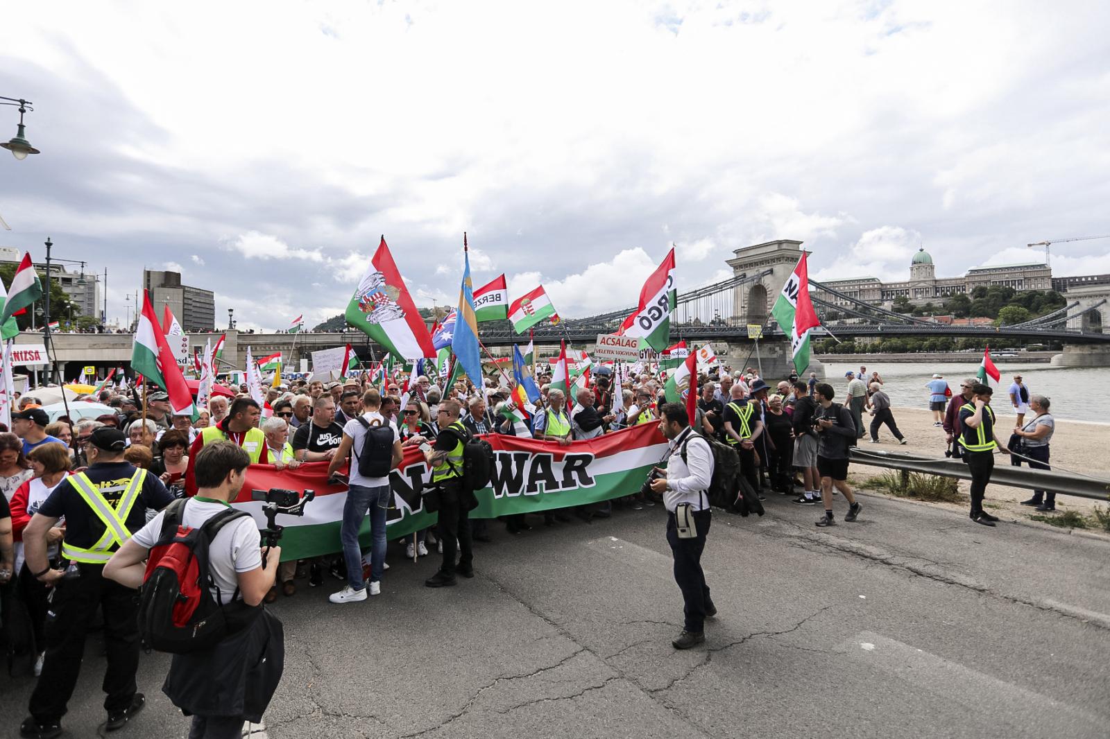 A gyülekezőt még nagyrészt esernyő alatt tartották, a tömeg most elég lassú tempóban halad a Margitsziget felé.