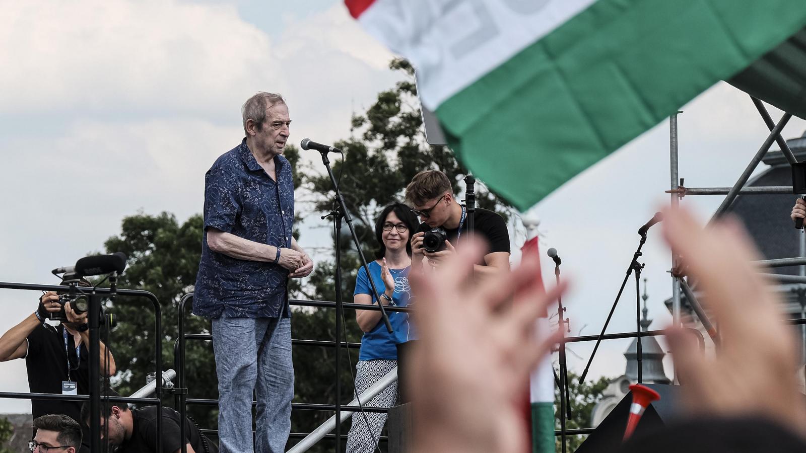 A részlet után Jordán Tamás elmondja a tömeggel Magyar Péter „lépésről lépésre” szlogenjét, majd szavazásra buzdít a vasárnapi önkormányzati és EP-választáson.
