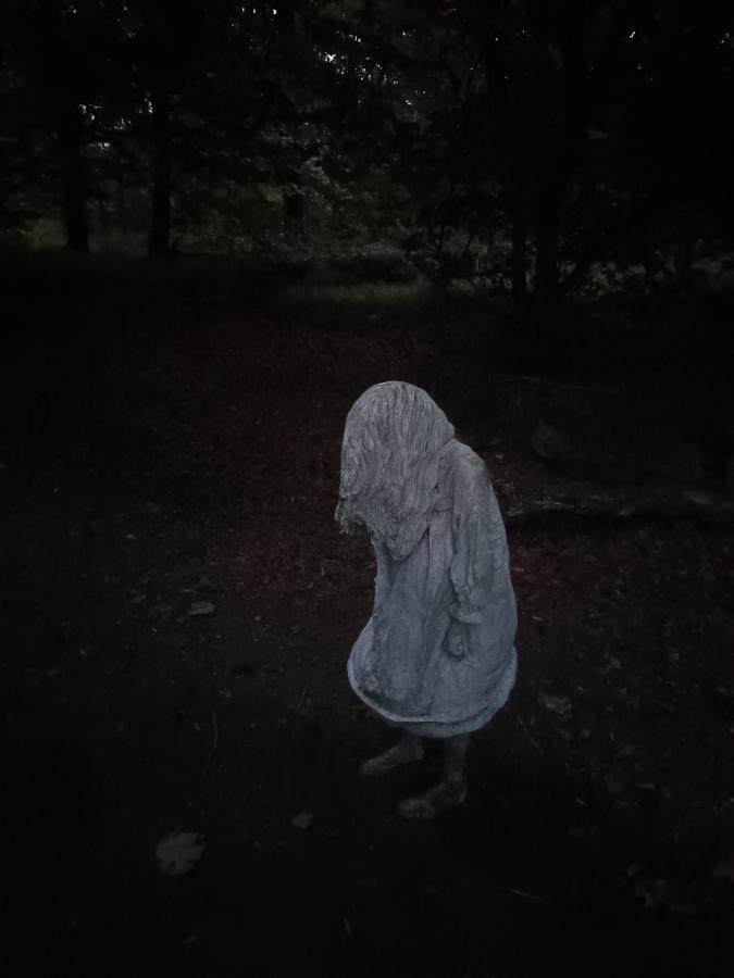 A sűrűben egy magányos kislány áll, a frász ver ki, már sötétedik, oda óvakodom, szobor, de olyan élethű, hogy kétszer visszafordulok, nem jön-e utánam.