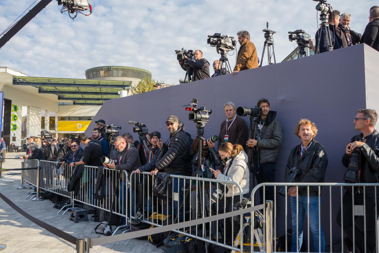 Kordonok mögé szorított újságírók és fotósok Orbán Viktor beszéde előtt a Millenárison.