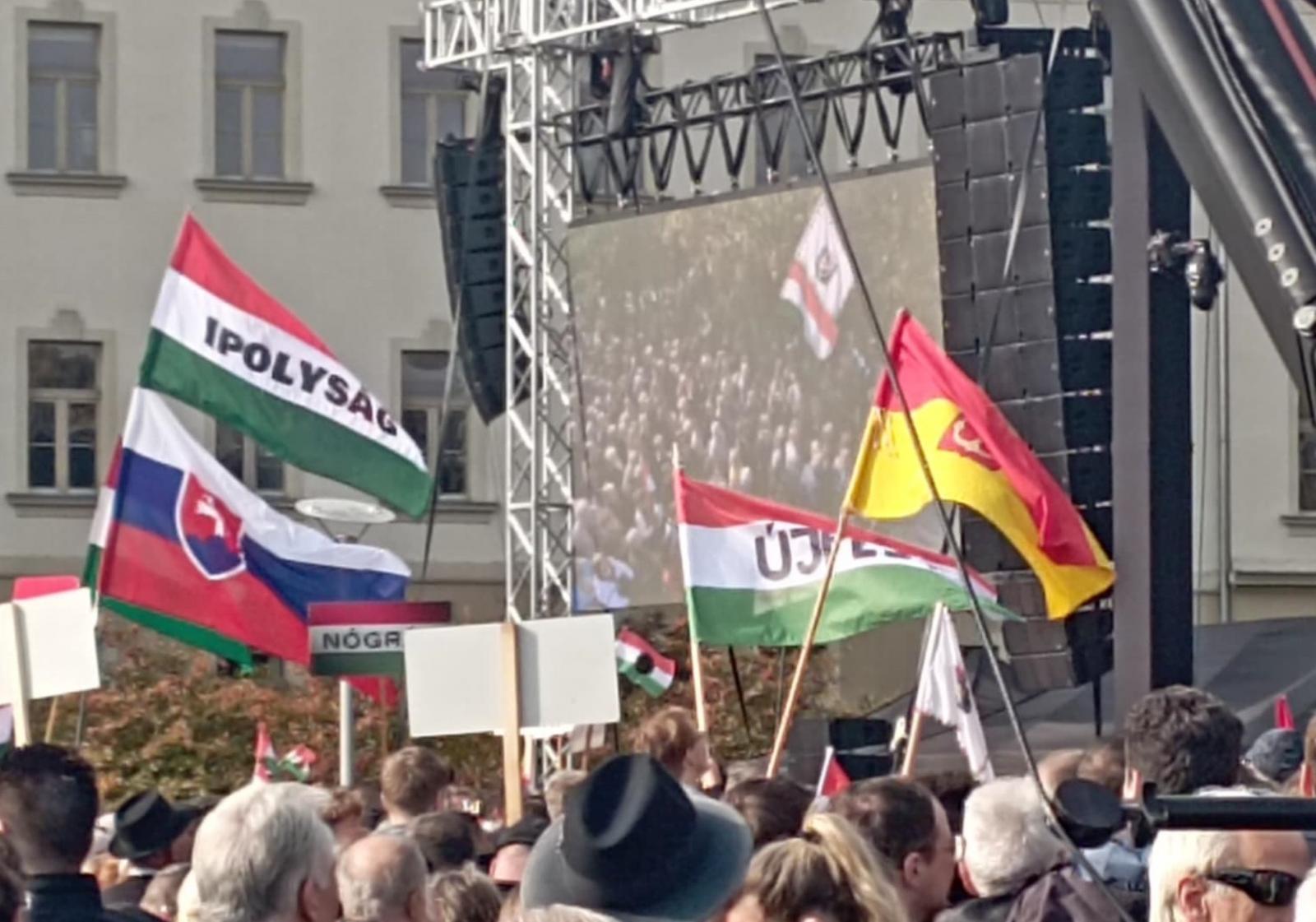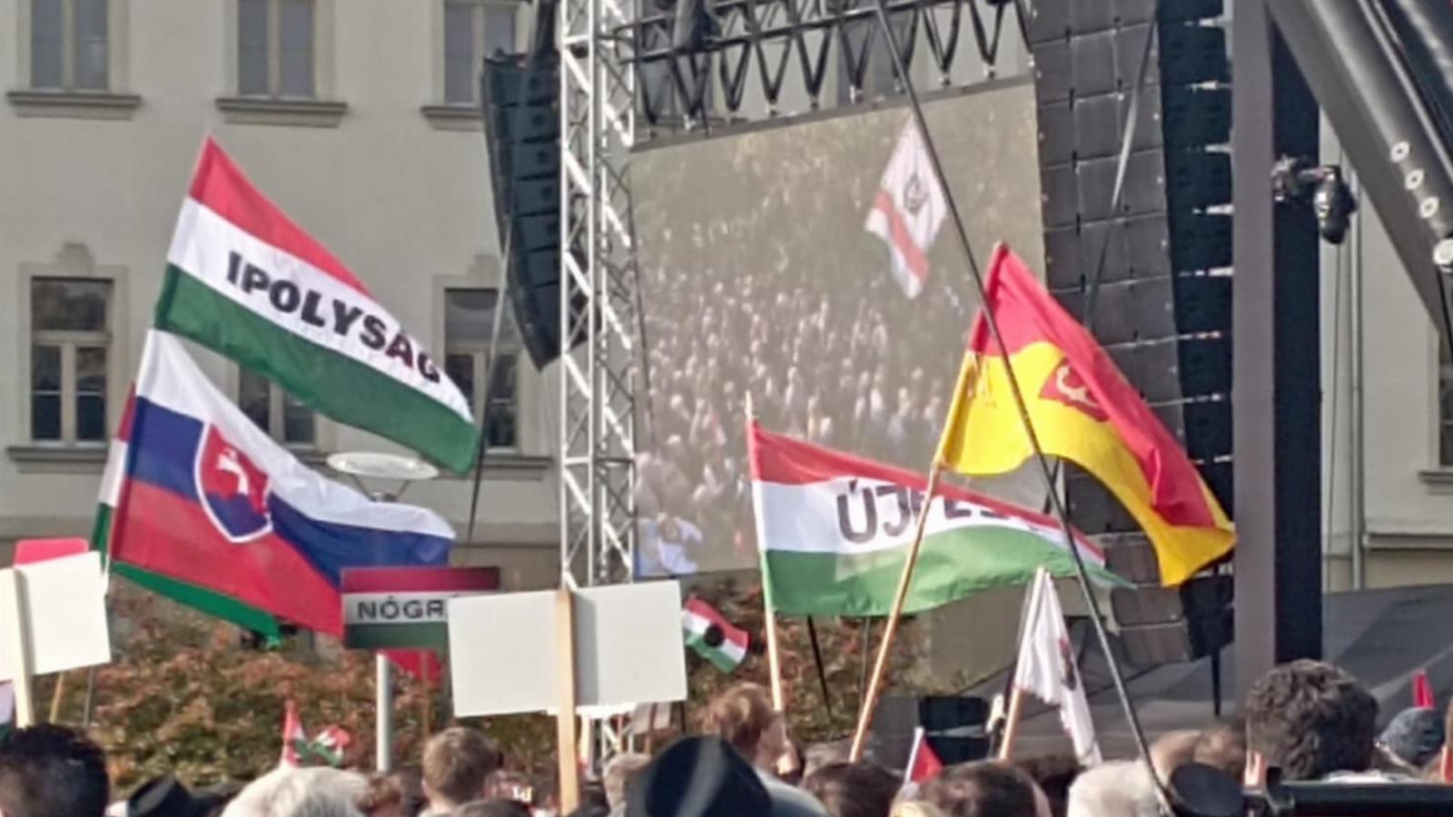 Bár a szlovák zászló Orbán Viktor beszéde alatt eltűnt, csak a szélcsend miatt nem lehetett látni, a magasban tartották akkor is.