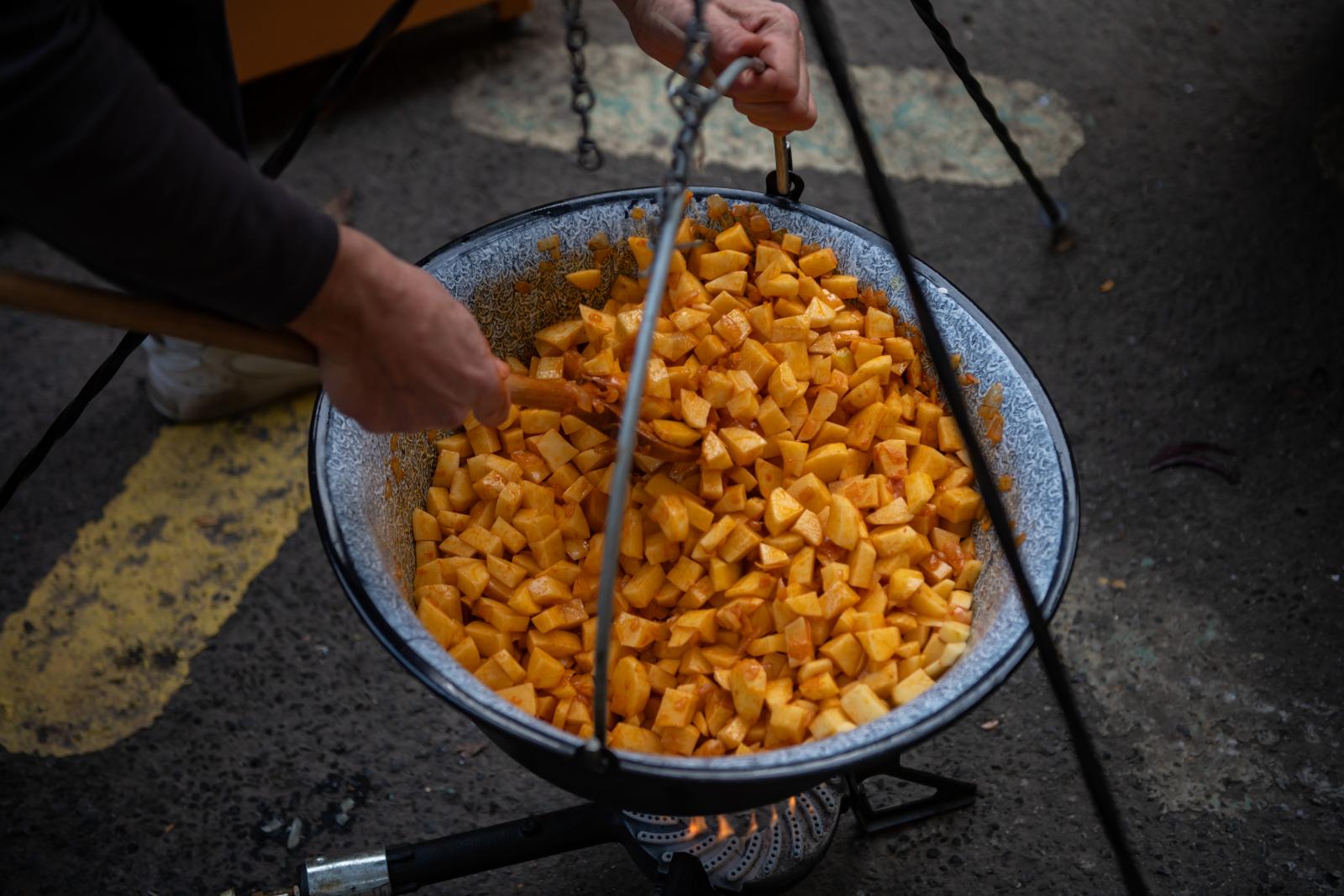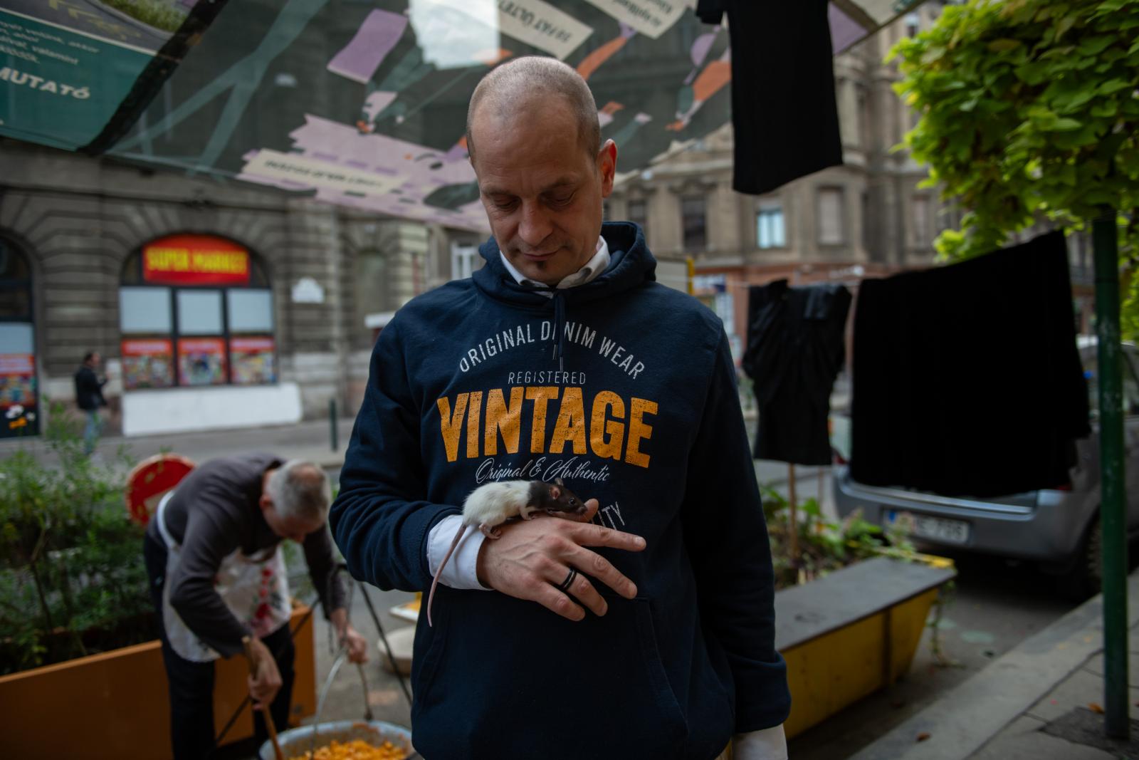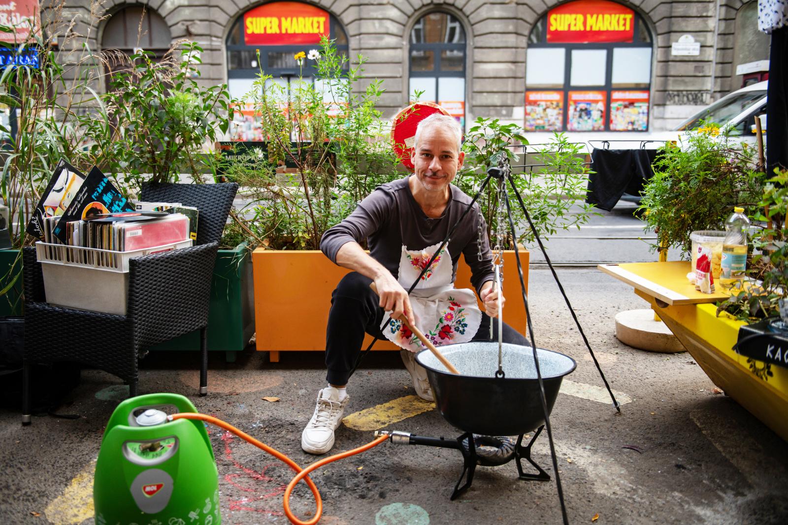 „Önkéntes vagyok, megkértek, hogy én főzzek ma – kavargatja a belevalót Gergely. – A Pápatéren (II. János Pál pápa tér – a szerző) lakom, és jártamban-keltemben találtam rá az Internépszínházra. Láttam, hogy új közösségi tér alakul, és hogy ezen milyen komoly csapat dolgozik. Csatlakoztam az évadnyitóra, ami az Internépszínházat testesíti meg, például azzal, hogy az utca forgatagában egy hatalmas bográcsban hagymát pirítok, amire mindjárt paprikát szórok. Ezt valahol kint, a nagy magyar pusztán kellene tennünk, ehelyett itt, a Népszínház utca közepén bográcsozunk. Népnemzeti mozdulatokat végzek egy liberális közegben, ami rávilágít, hogy egy összeegyeztethetetlen kettős identitásban vagyunk. Szereplést is vállaltam, Blaha Lujzáné leszek az esti Ki Mit Tudna? előadásban. Bárki megmutathatja magát, és megörvendeztetheti produkciójával a közönséget egy tízperces fellépéssel, ezzel is hozzájárulva a közösségépítéshez. A kultúra segítségével összehozzuk az embereket, amit kifejez a főzés és az együtt étkezés öröme is.”