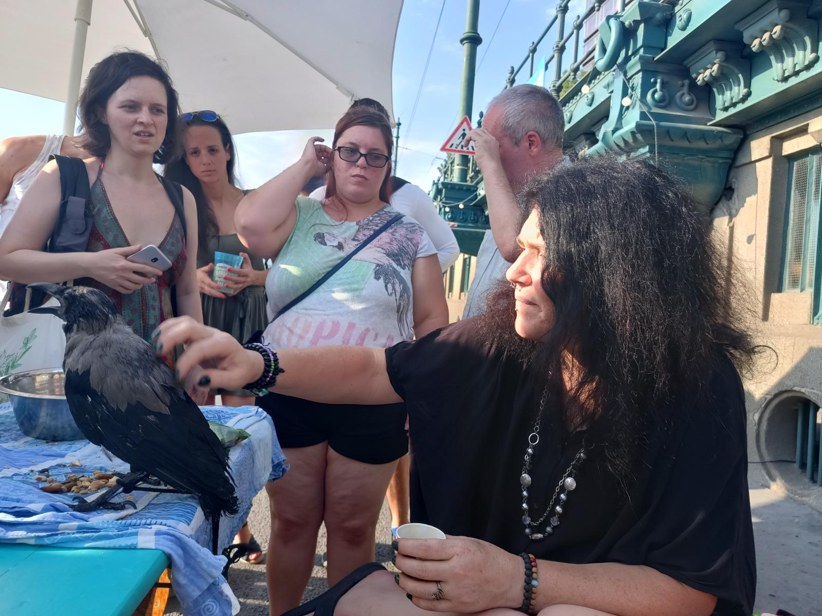 Még a nyár végén, amikor hétvégente a pesti alsó rakpartot a gyalogosok vehették birtokba, a Viadukt bár sarkánál, egy asztal körül több ember nézelődött. Az asztalon két varjú állt, körülöttük emberek, akik beszélgettek, és csodálták a fekete tollazatú szárnyasokat. Amikor az asztalhoz értem, az egyik varjútartó srác éppen pakolta össze a cókmókját és a varjút, akit nemes egyszerűséggel Madárnak nevezett el. Viszont Pintér Attila, a varjúsimogatás főszervezője és Veres Dorottya önkéntes varjúsegítő készségesen állt az érdeklődők rendelkezésére.