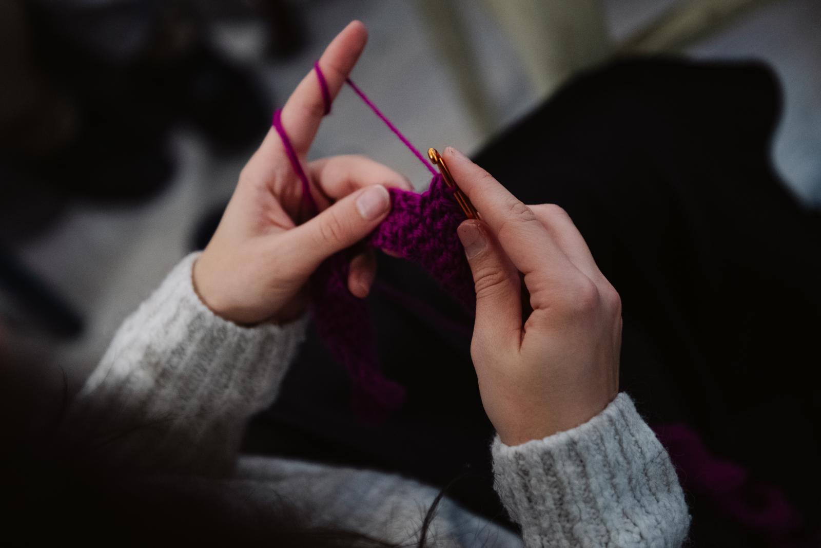 „Én itt lakom a közelben, rendszeresen járunk ide kávézni a lakótársammal. Egy alkalommal letámadtak, hogy itt meg lehet tanulni horgolni, és bekapcsolódtam. Kívülről nagyon egyszerűnek tűnhet, de ez egy brutálisan bonyolult tudomány. Az hozta most a megváltást, hogy rájöttem, hogyan kell kijavítani a hibát, vagy ignorálni, ha elrontottam valamit” – mondja Gelle Szebasztián, a horgolókör eleddig egyedüli férfi tagja. Eszti közben kedves szavakkal biztatja, dicséri őt. Többször látja, hogy az emberek szinte gyermeki örömöt élnek át, amikor horgolni tanulnak, ami számára is sikerélmény. A kézművesség és a finommotorika tornáztatása az agyat is karbantartja, emellett nagyon mély fókuszt tud adni, ami különösen fontos a figyelmünket felszínessé tevő digitális korban – ehhez tud csatlakozni Anna, aki online dolgozik, ezt próbálja ellensúlyozni a kézműves-tevékenységgel.