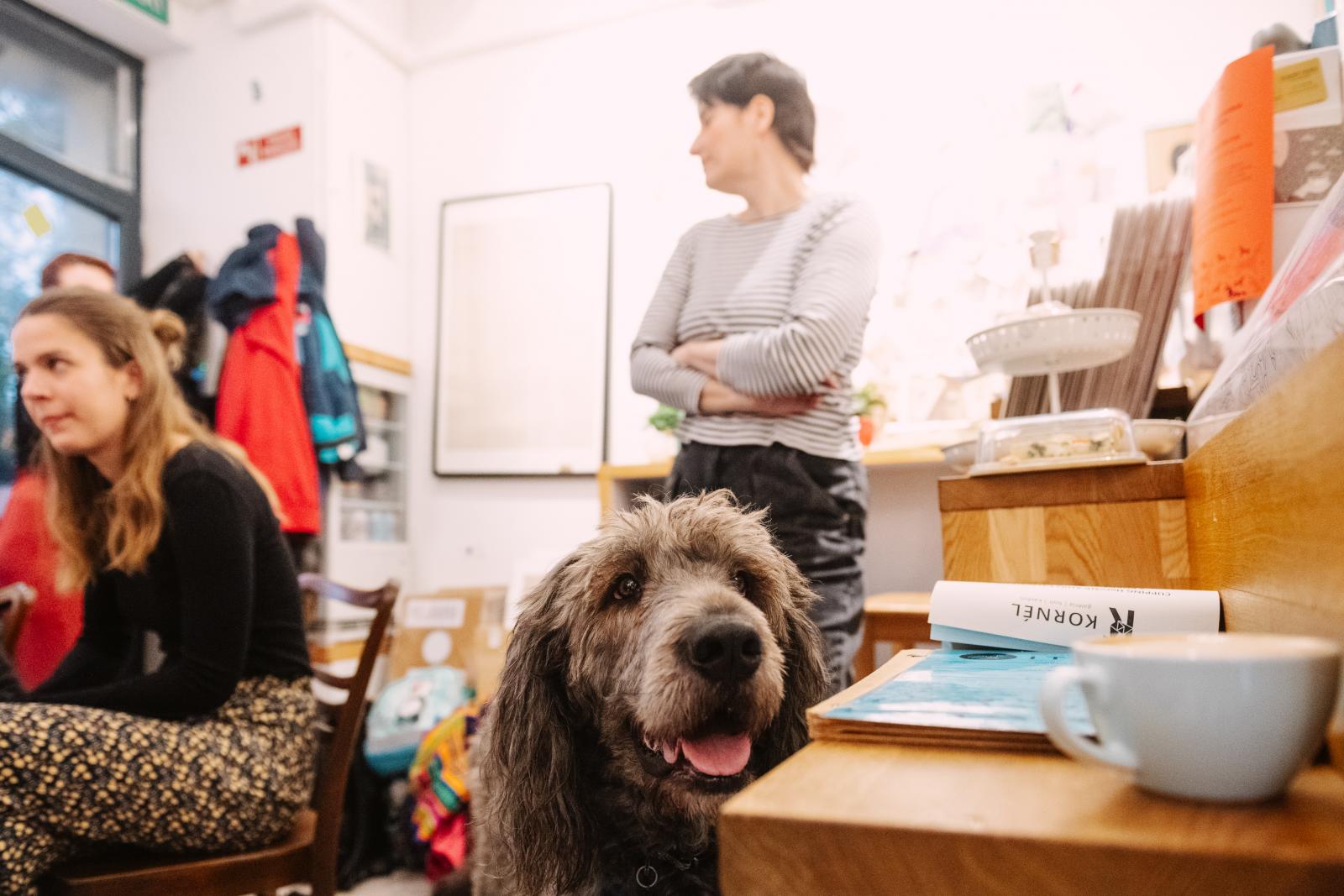 Már a bejáratnál összefutunk Máray Mariann grafikus-illusztrátorral, akinek különleges zöldséggrafikáiról és a szöveget mellőző, csendes könyveiről is írtunk a Visszhangban. Számára a Kornél több, mint törzshely: a béke szigete, ahol a lelke megpihen, és itt tud az egyik félreeső asztalhoz leülve elmélyülten alkotni is.