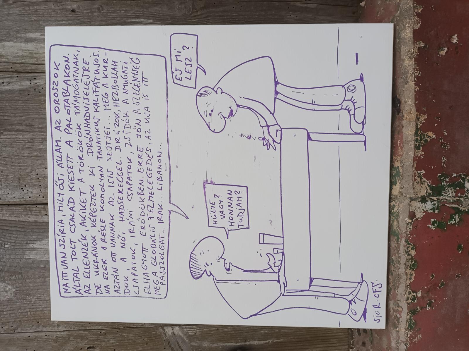 Alkotói szabadidejében rajzol, és amikor nincs a keze ügyében filctoll, akkor fejben rajzol. Tele van összefüggésekkel, véleményekkel, kiakadásokkal és beakadásokkal, de főként emberséggel. Ismét egy csokor tőle, mielőtt újra visszament a tetőre melózni.
