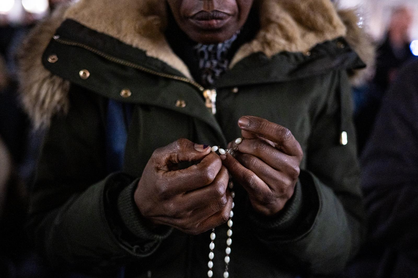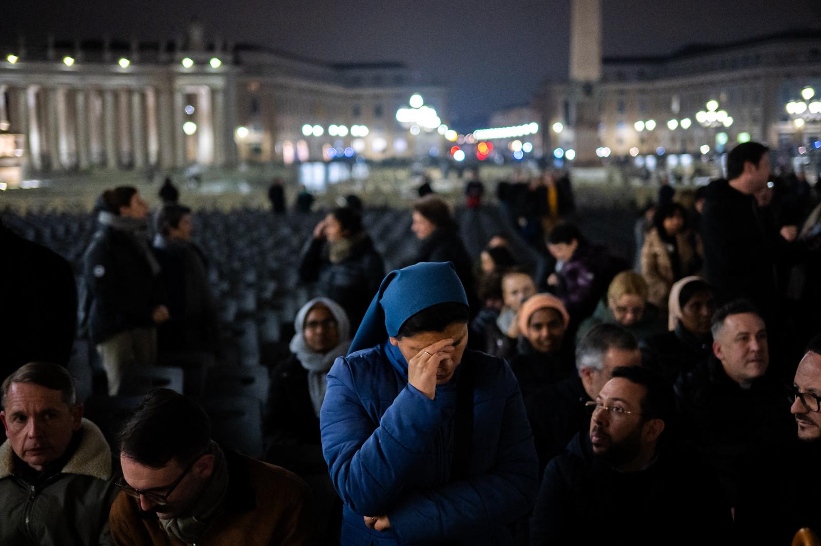 A rózsafüzér imát a katolikus egyházfő gyógyulásáért mondták. A bazilika előtt hétfő este legalább tízezer ember gyűlt össze. Ferenc pápa február közepén légzési nehézségek miatt került kórházba.