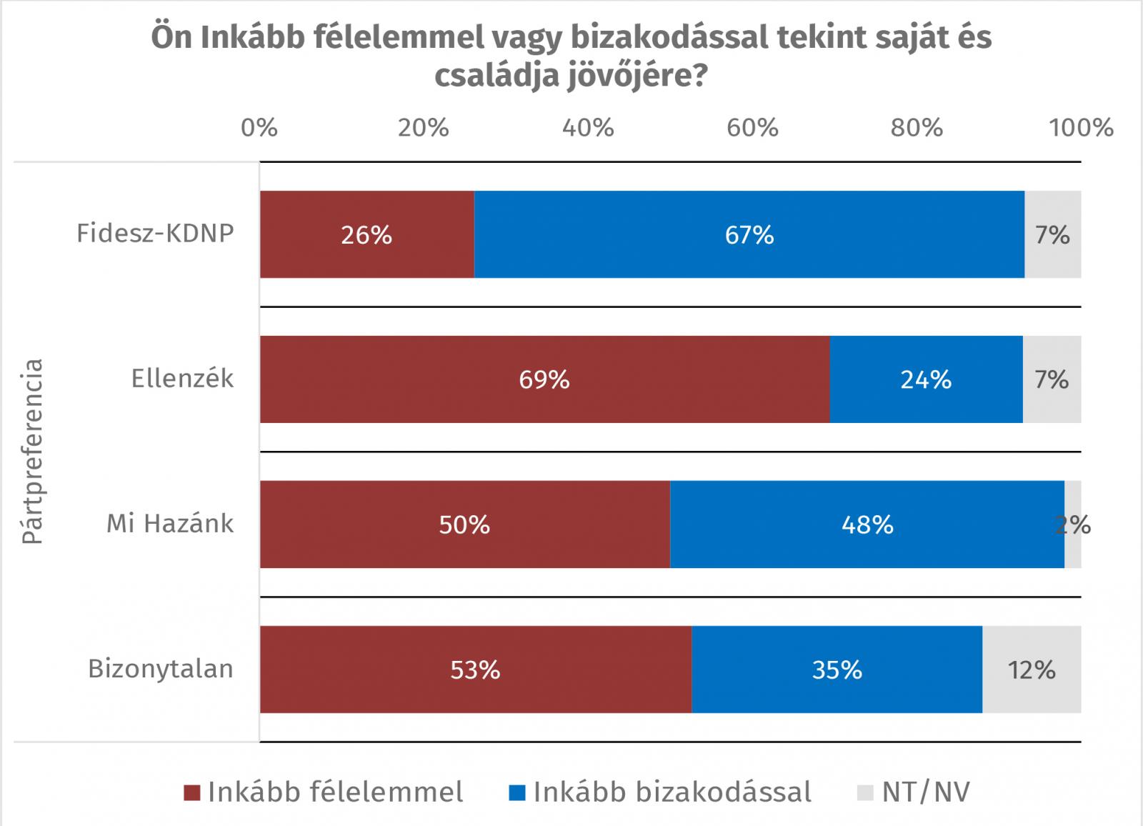 A felmérés eredményei szerint a pártpreferencia van a legjelentősebb befolyással a jövőképre. A kormánypárti szavazók mindössze negyede rendelkezik negatív jövőképpel, kétharmaduk bizakodó. Ezzel szemben tízből hét ellenzéki (69 százalék) félelemmel tekint saját és családja jövőjére, és mindössze negyedük bizakodó.