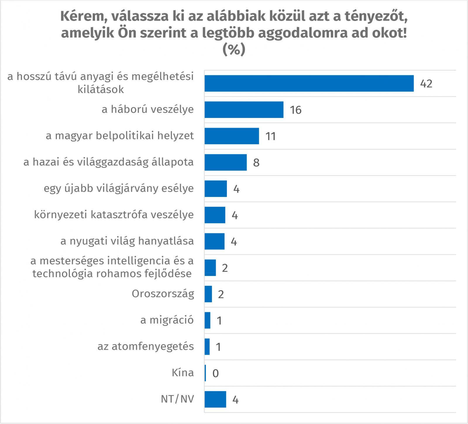 A felmérésben rákérdeztek, mire irányul a magyarok félelme. A kérdezetteknek előre megadott listából kellett kiválasztania azt a tényezőt, ami szerintük a legnagyobb aggodalomra ad okot. E tekintetben toronymagasan a hosszú távú anyagi és megélhetési kilátásoktól tartanak a legtöbben, a válaszadók 42 százaléka.