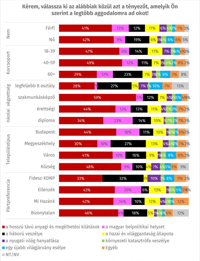 Az ellenzéki szavazókat ezzel szemben a megélhetés aggasztja a legjobban (46 százalék), amelyet a belpolitikai helyzet (20 százalék) és a hazai és világgazdaság állapota (13 százalék) követ. A bizonytalanokat pedig is a megélhetés aggasztja a legjobban, de körükben is a teljes népességénél magasabb (18 százalék) a háborútól rettegők aránya.