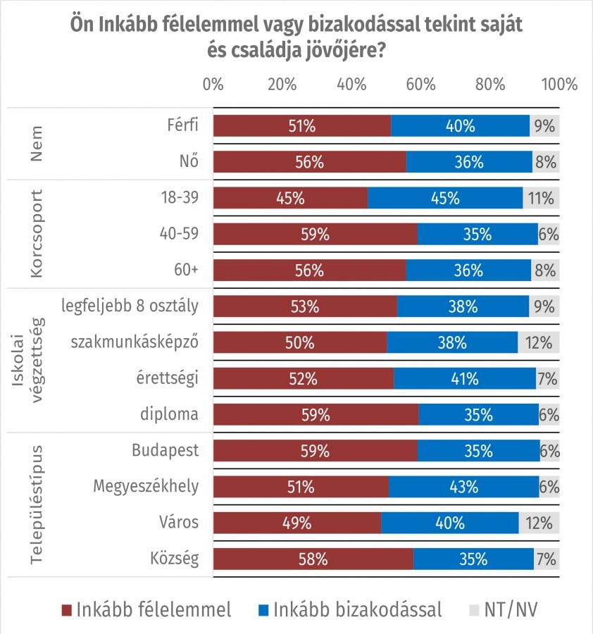 A válaszadók abszolút többsége (54 százalék) fél, ha saját és családja jövőjére gondol, és mindössze 38 százalékuk tekint a jövőjére bizakodva. A nemek szerinti eloszlást tekintve elmondható, hogy a nők negatívabban álltak a jövőhöz, mint a férfiak.