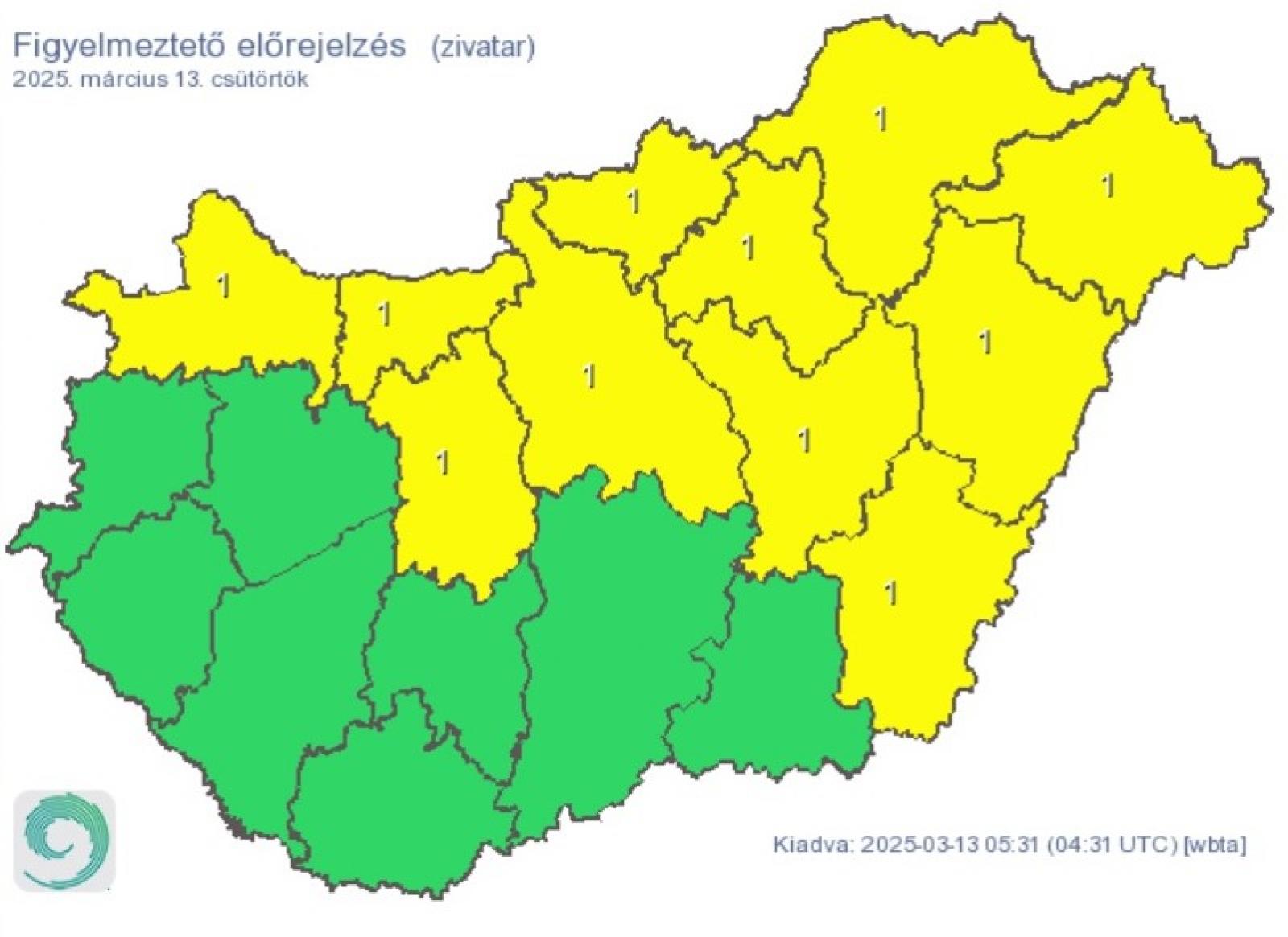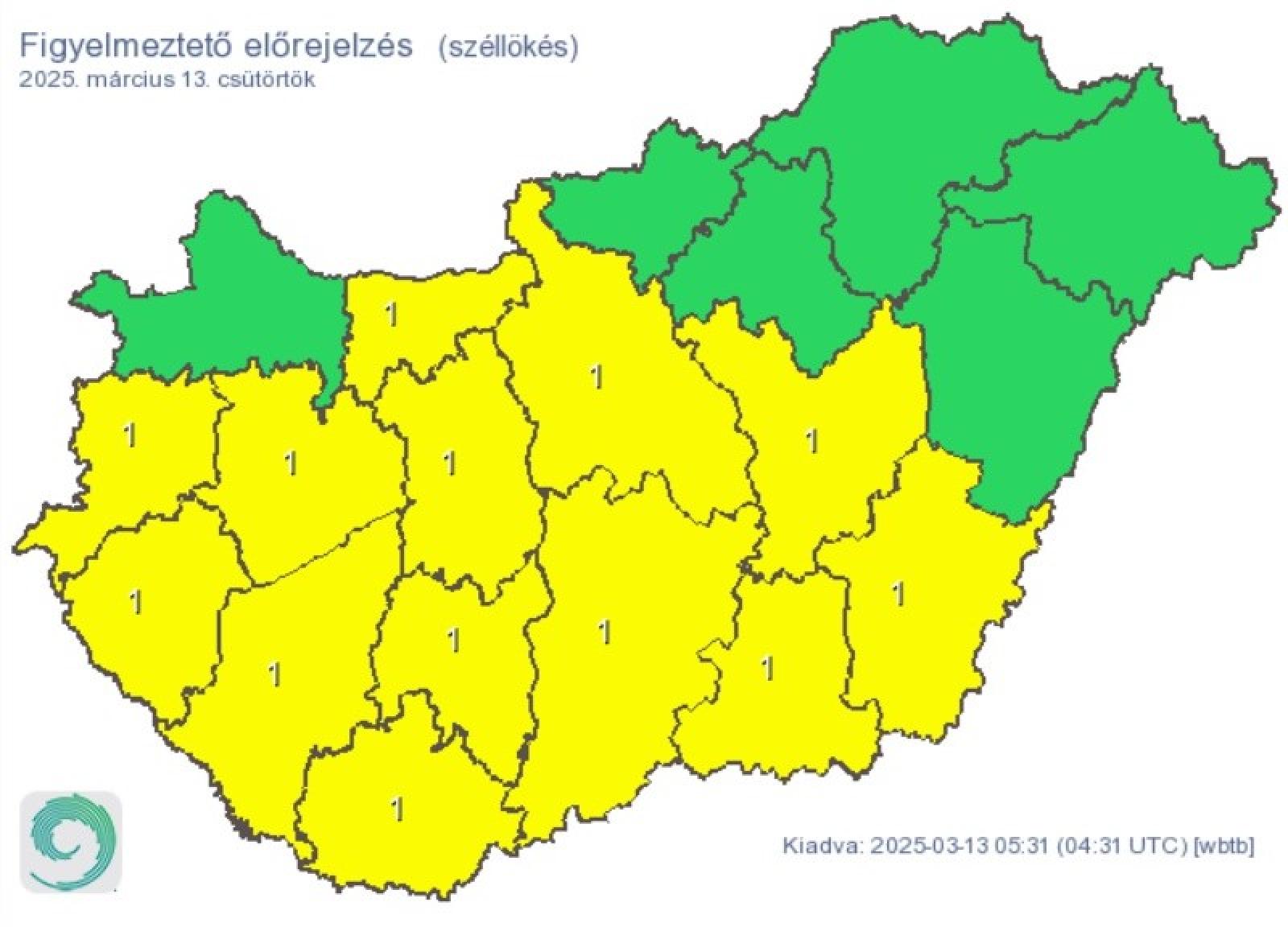 Délelőttől elsősorban a Dunántúlon és a középső országrészben várhatók nagy területen viharos széllökések, ám időnként keleten is erős szélre számíthatunk. Estére fokozatosan csillapodik a légmozgás. A szél miatt tizenhárom vármegyében (Pest, Baranya, Bács-Kiskun, Békés, Csongrád-Csanád, Fejér, Komárom-Esztergom, Somogy, Jász-Nagykun-Szolnok, Tolna, Vas, Veszprém és Zala) van érvényben figyelmeztetés.