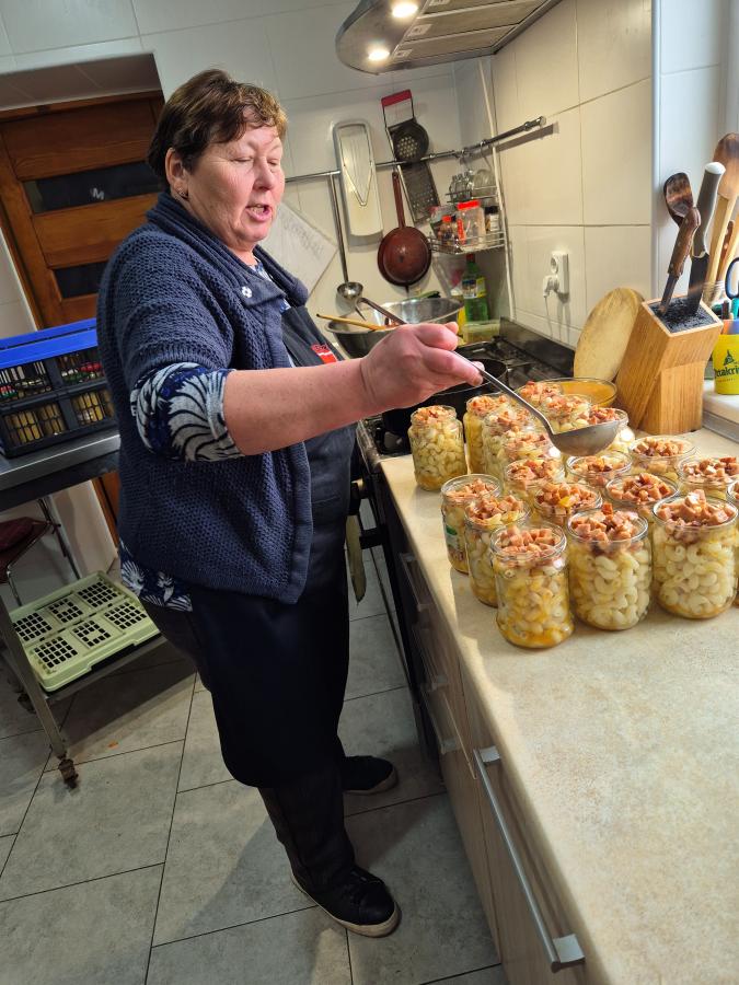Levegőznek az éhesek is, akik sort állnak a máltai ház kapujában. Igyekszünk időre, délre odaérni a raktárból, én vagyok kulcspozícióban, nyitom a kaput, jönnek az emberek, kicsi szatyorban befőttesüvegek. Adják le az üveget, kapnak előző nap leadott, tisztára mosott üvegben leveskét meg másodikat. Van paradicsomleves, isteni finom, tökleves, igen finom, borscs, arra ünnepet ültünk, meg sárgaborsóleves, hűnnnnye, aztán puliszka, hát annak, akinek, hajdinakása meg káposztás tészta – mi is az éhesek menüjéből kaptunk. Azért jó már most itthon, csirkepöri, rántott hús…