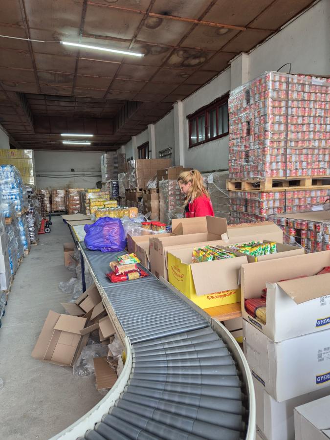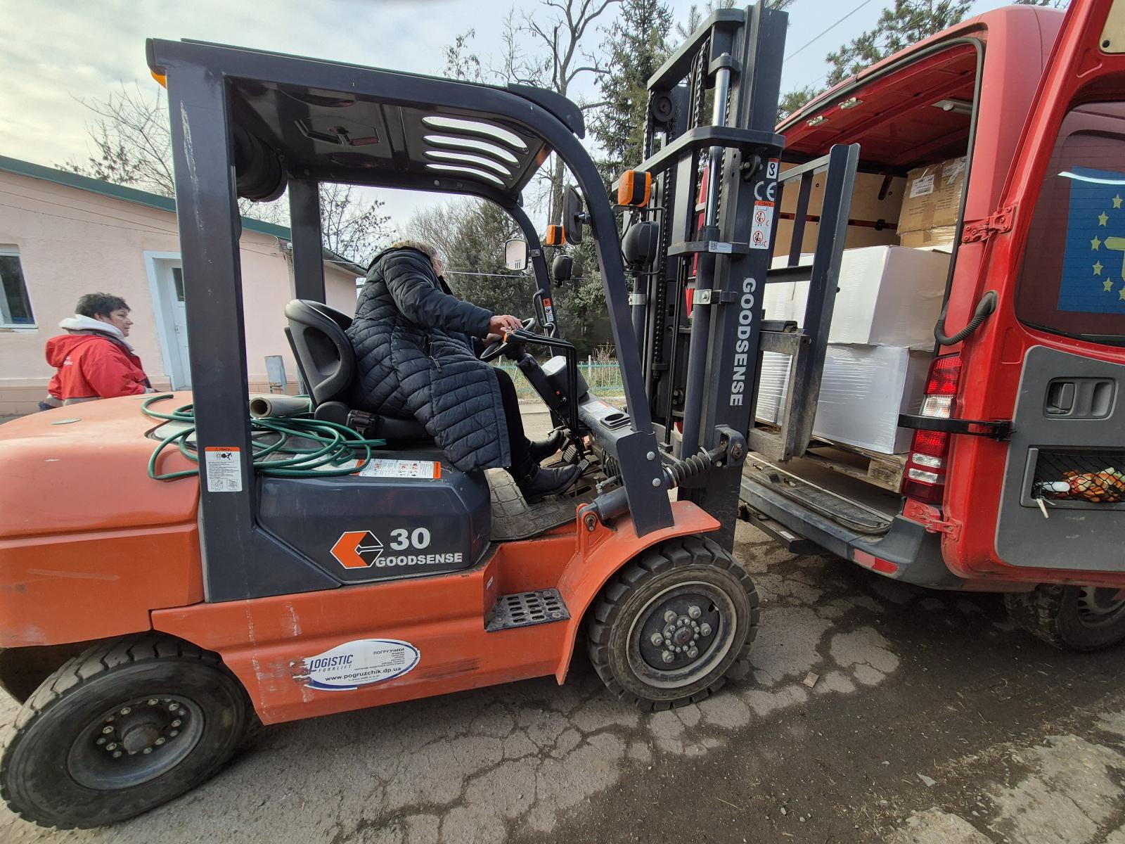 A raktár mint hangár. Hosszú méterek magasában zöldborsók egymáson, babkonzervek, lisztek, cukros-, rizseszacskók, paradicsompüré üvegekben, dobozok stószolva, csokit, gyorslevest, kekszet, kétszersültet rejtenek. Targoncával emelte magasba Tünde, ő a Máltai Szeretetszolgálat beregszászi járási csoportjának egyik vezetője. De a prímet Nóra, a vezetőnk viszi, mert ő az elektromos targoncát is tudja kezelni. Ami nem semmi, mert ez pici ugyan, könnyen fordul a liszteszsákok között, ám oldalt vannak a villái. Hát, még nézni is tereh.