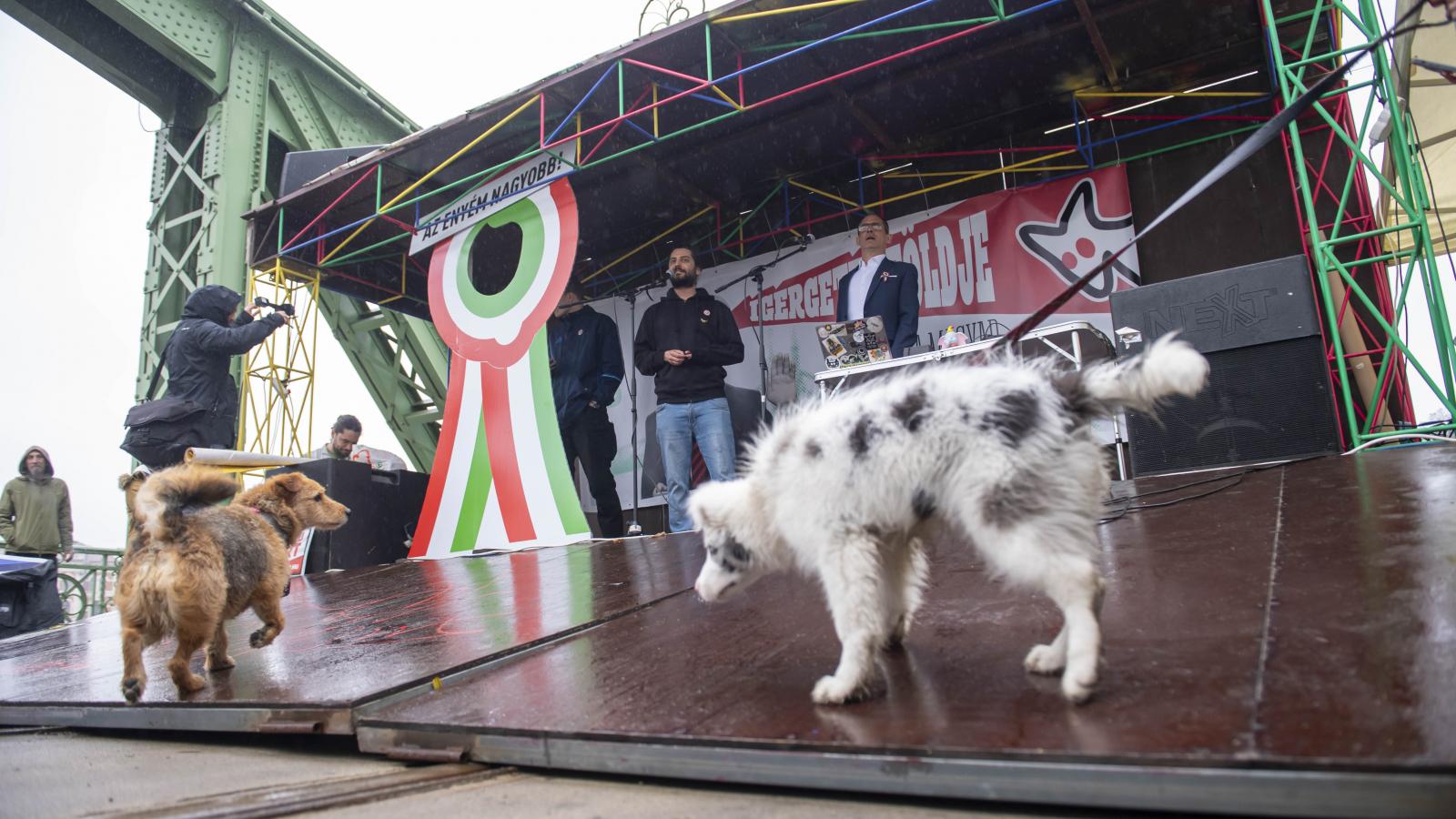 A Magyar Kétfarkú Kutya Párt a Szabadság hídon ünnepelte március 15-ét, szimpatizánsai körülbelül ezren lehettek. Fesztiválhangulat van, a gyerekeknek kisebb ugrálóvárral kedveskedtek. Kovács Gergely, a párt társelnöke öltönyben mond beszédet, amit persze nem csak úgy elmond, hanem egy mellette álló kamu kampánytanácsadó instruálta. – Orbán Viktor miatt nem gyullad meg a nedves fa a kazánban... – kiabálja, aztán arról beszél, hogy mit ígér a magyar nemzet. Elhangzik az örök élet ingyen sör, korrupciós pénzeket mindenkinek. Akad békegalamb- és béketank-origami, Nem beszélve a zenére ugráló, táncoló dinóról, akivel a kisebbek-nagyobbak is előszeretettel fotózkodtak.