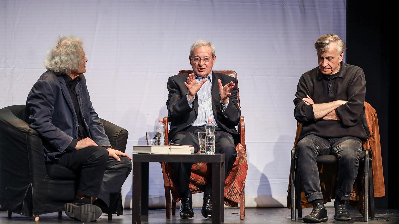 Nincs abban semmi meglepetés, hogy Nádas Péter író neve telt házat vonz egy színházban. Ezúttal nem csak drámaíróként volt jelen a Színházi Világnapon az Örkény Színházban, hanem beszélgetőpartnerként és nem mellékesen az est végén dedikálta az írótárs Forgách Andrással együtt, a Jelenkor Kiadónál most megjelent köteteteket. Forgách néhány éve írt egy darabot Szorul a hurok címmel Nádas Péter Párhuzamos történetek című regényének motívumai alapján. A művet 2014-ben mutatták be a Rózsavölgyi Szalonban Takács Katalin, Bánfalvi Eszter és Balikó Tamás játszotta a három szereplőt, a narrátor maga a szerző volt. Most az Örkény Színházban Csákányi Eszter, Szandtner Anna és Patkós Márton szerepelt a Znamenák István által rendezett felolvasó színházi előadásban. A történet narrátora Mácsai Pál volt, aki a hangokat – csengő, eső, ablaktörlőlapát – is produkálta. Forgách András egy taxis jelenetet, amely átszövi a regényt, írt meg három „futamban”. Akira Kuroszava A vihar kapujában című művéhez hasonlóan. Itt is mindegyik epizódban valamelyik szereplő nézőpontjából ismerjük meg a történetet. Az Örkény Színház színészei épp ezeket a nézőpont váltásokat érzékeltették finoman poentírozva. A felolvasást követő beszélgetésben Nádas Péter is utalt erre. Egyébként Forgách Andrással együtt mindketten a színpadon hallgatták végig a felolvasó színházi előadást. Aztán „szünet nélkül” jött a beszélgetés. Ez a mozzanat pedig utalt az új kötet címére, a Jelenkornál megjelent könyv Nádas Péter öt drámáját – Protokoll (1966), Takarítás (1977), Találkozás (1979), Temetés (1980), és Szirénének (2010) – tartalmazza. A Jelenkor most kiadta Forgách András Szorul a hurok című művének szövegét is.